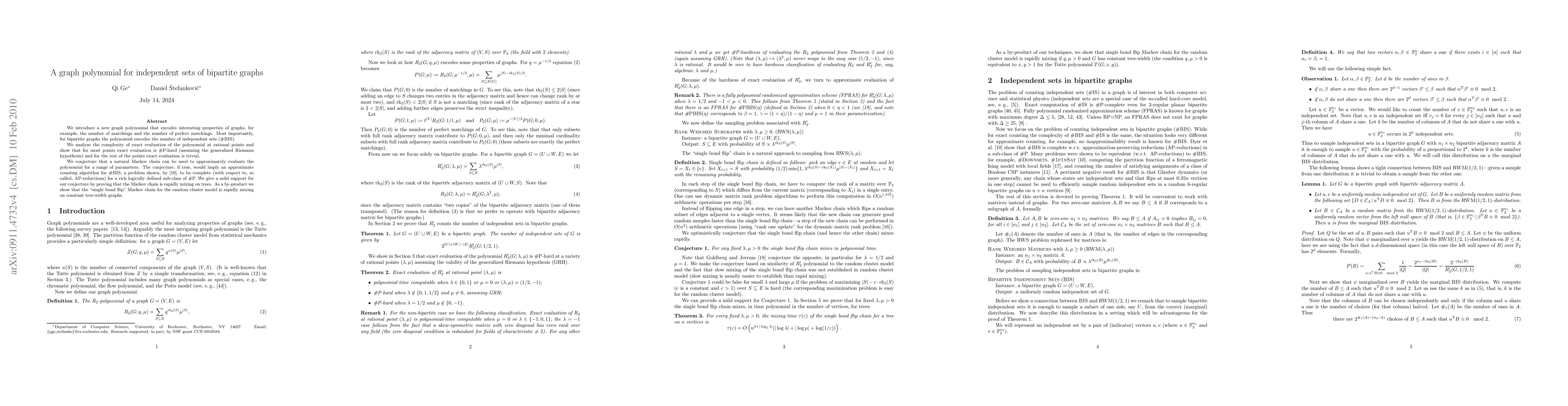 We introduce a new graph polynomial that encodes interesting properties of graphs, for example, the number of matchings and the number of perfect matchings. Most importantly, for bipartite graphs the polynomial encodes the number of independent sets (#BIS). We analyze the complexity of exact evaluation of the polynomial at rational points and show that for most points exact evaluation is #P-hard (assuming the generalized Riemann hypothesis) and for the rest of the points exact evaluation is trivial. We conjecture that a natural Markov chain can be used to approximately evaluate the polynomial for a range of parameters. The conjecture, if true, would imply an approximate counting algorithm for #BIS, a problem shown, by [Dyer et al. 2004], to be complete (with respect to, so called, AP-reductions) for a rich logically defined sub-class of #P. We give a mild support for our conjecture by proving that the Markov chain is rapidly mixing on trees. As a by-product we show that the "single bond flip" Markov chain for the random cluster model is rapidly mixing on constant tree-width graphs.