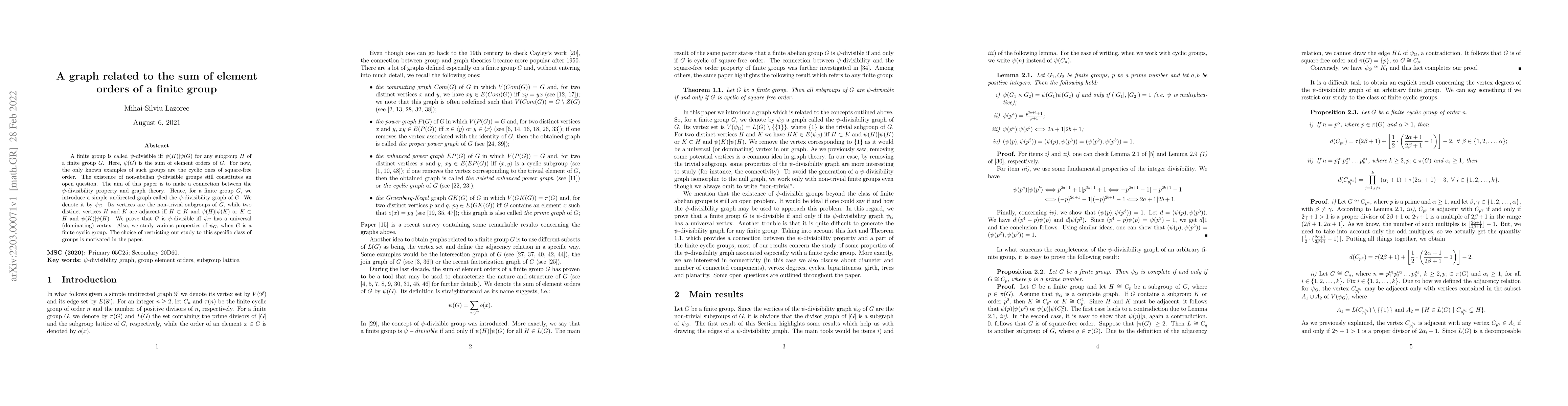 A finite group is called $\psi$-divisible iff $\psi(H)|\psi(G)$ for any subgroup $H$ of a finite group $G$. Here, $\psi(G)$ is the sum of element orders of $G$. For now, the only known examples of such groups are the cyclic ones of square-free order. The existence of non-abelian $\psi$-divisible groups still constitutes an open question. The aim of this paper is to make a connection between the $\psi$-divisibility property and graph theory. Hence, for a finite group $G$, we introduce a simple undirected graph called the $\psi$-divisibility graph of $G$. We denote it by $\psi_G$. Its vertices are the non-trivial subgroups of $G$, while two distinct vertices $H$ and $K$ are adjacent iff $H\subset K$ and $\psi(H)|\psi(K)$ or $K\subset H$ and $\psi(K)|\psi(H)$. We prove that $G$ is $\psi$-divisible iff $\psi_G$ has a universal (dominating) vertex. Also, we study various properties of $\psi_G$, when $G$ is a finite cyclic group. The choice of restricting our study to this specific class of groups is motivated in the paper.