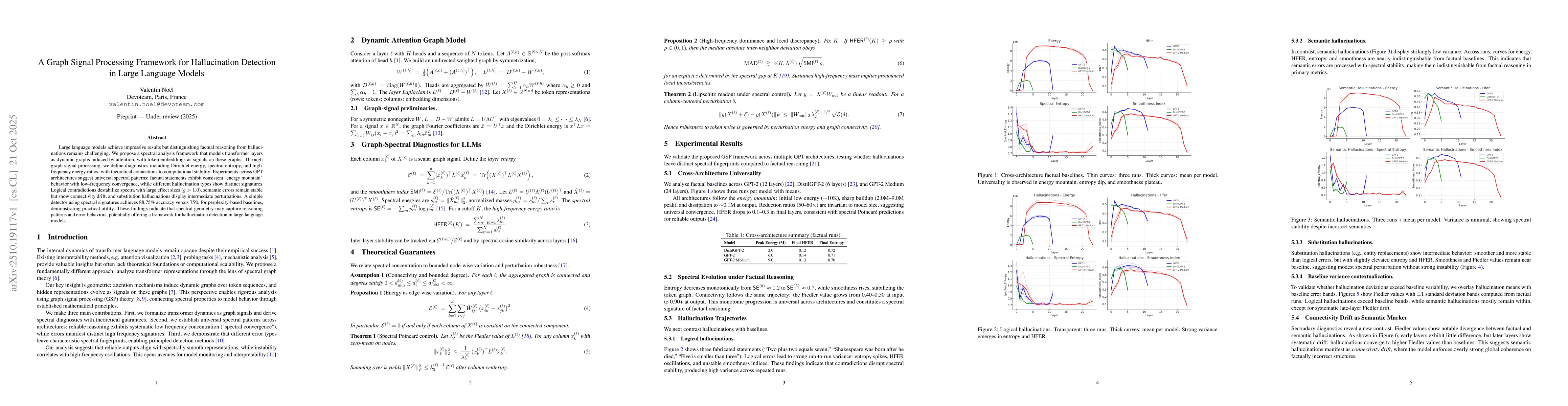 Large language models achieve impressive results but distinguishing factual reasoning from hallucinations remains challenging. We propose a spectral analysis framework that models transformer layers as dynamic graphs induced by attention, with token embeddings as signals on these graphs. Through graph signal processing, we define diagnostics including Dirichlet energy, spectral entropy, and high-frequency energy ratios, with theoretical connections to computational stability. Experiments across GPT architectures suggest universal spectral patterns: factual statements exhibit consistent "energy mountain" behavior with low-frequency convergence, while different hallucination types show distinct signatures. Logical contradictions destabilize spectra with large effect sizes ($g>1.0$), semantic errors remain stable but show connectivity drift, and substitution hallucinations display intermediate perturbations. A simple detector using spectral signatures achieves 88.75% accuracy versus 75% for perplexity-based baselines, demonstrating practical utility. These findings indicate that spectral geometry may capture reasoning patterns and error behaviors, potentially offering a framework for hallucination detection in large language models.