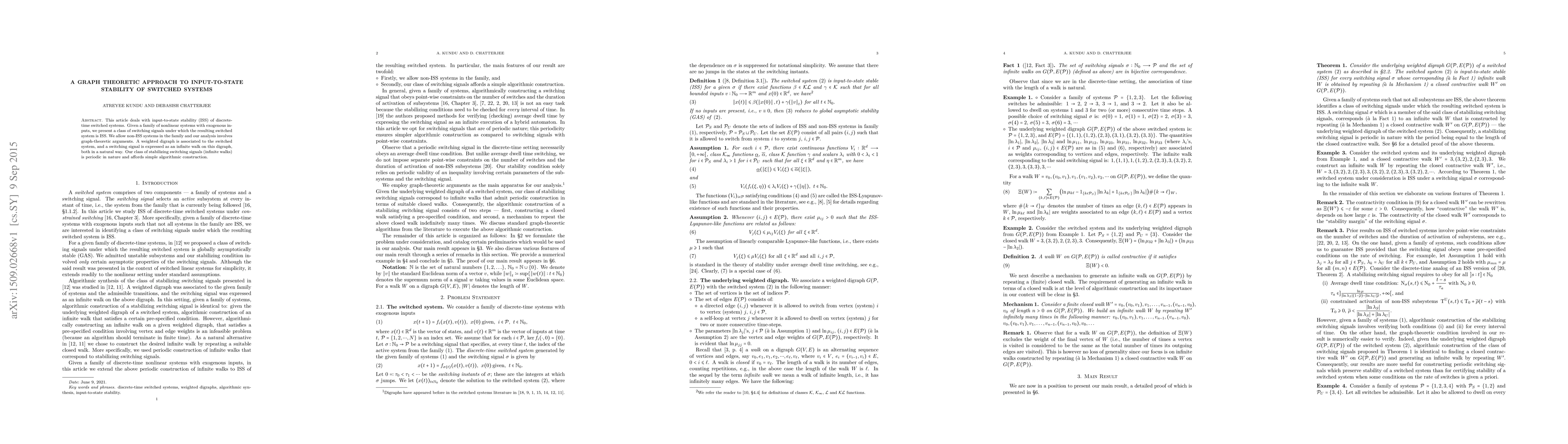 This paper presents a graph-theoretic approach to proving input-to-state stability (ISS) for discrete-time switched systems, allowing non-ISS systems, and constructs periodic switching signals as infinite walks on a weighted digraph for stabilization.