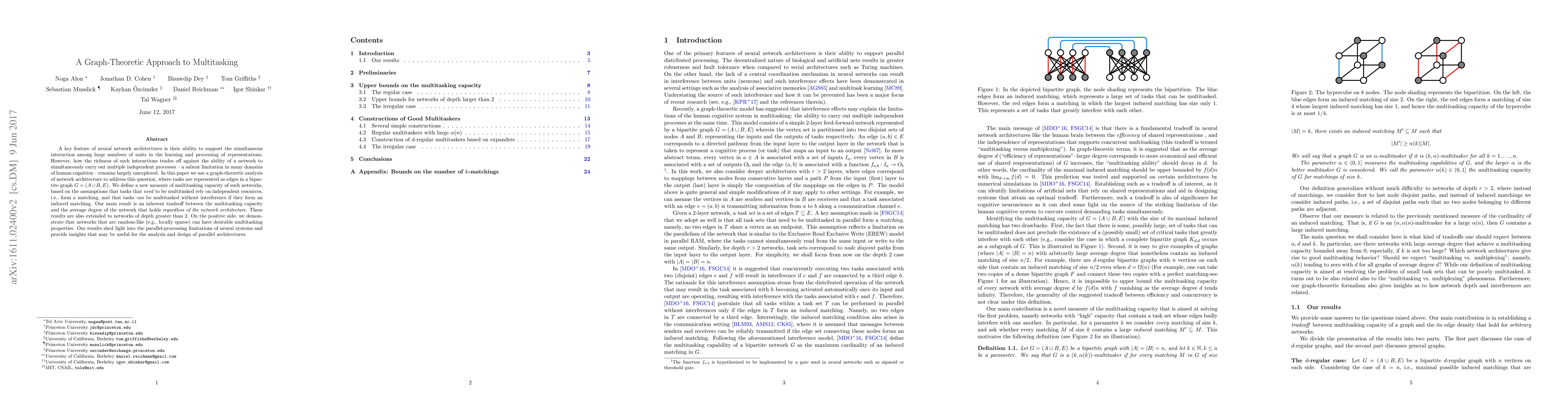 This paper employs a graph-theoretic approach to analyze the multitasking capacity of neural networks, revealing a fundamental tradeoff between multitasking ability and network average degree. It introduces a new measure based on matchings in bipartite graphs and shows that random-like, locally sparse networks can exhibit favorable multitasking properties.