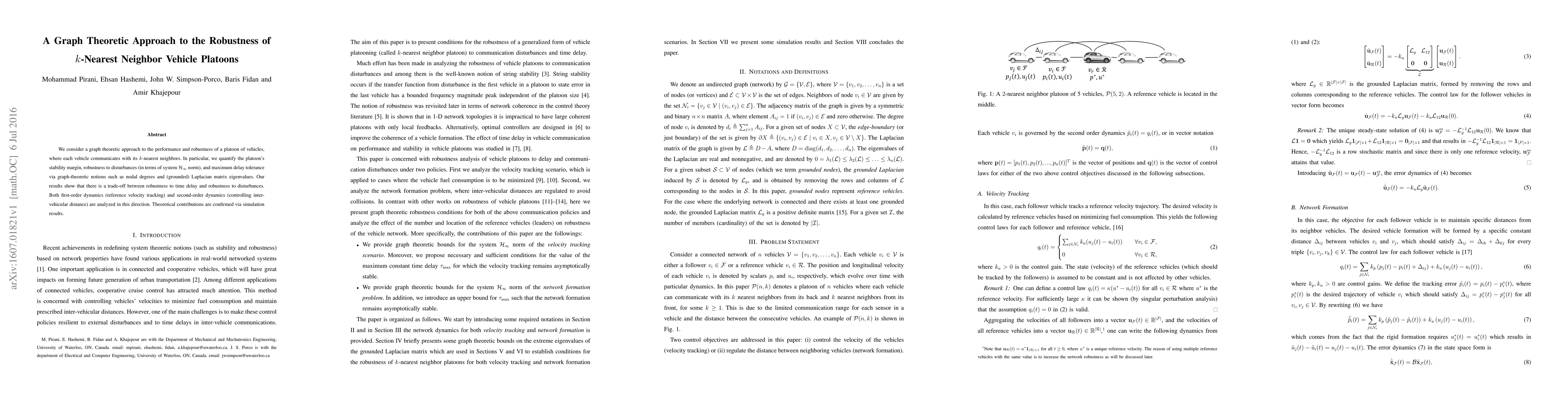 We consider a graph theoretic approach to the performance and robustness of a platoon of vehicles, where each vehicle communicates with its $k$-nearest neighbors. In particular, we quantify the platoon's stability margin, robustness to disturbances (in terms of system $\mathcal{H}_{\infty}$ norm), and maximum delay tolerance via graph-theoretic notions such as nodal degrees and (grounded) Laplacian matrix eigenvalues. Our results show that there is a trade-off between robustness to time delay and robustness to disturbances. Both first-order dynamics (reference velocity tracking) and second-order dynamics (controlling inter-vehicular distance) are analyzed in this direction. Theoretical contributions are confirmed via simulation results.