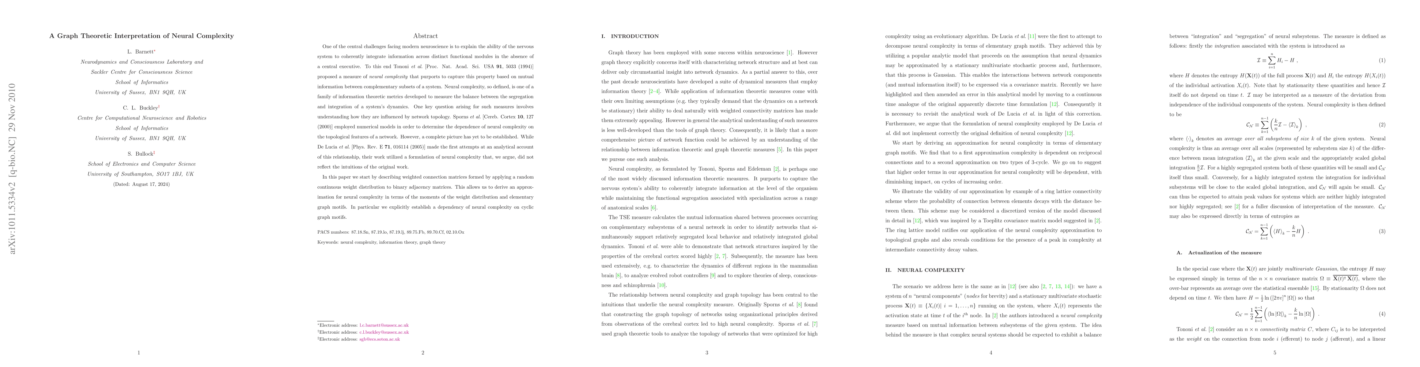 One of the central challenges facing modern neuroscience is to explain the ability of the nervous system to coherently integrate information across distinct functional modules in the absence of a central executive. To this end Tononi et al. [Proc. Nat. Acad. Sci. USA 91, 5033 (1994)] proposed a measure of neural complexity that purports to capture this property based on mutual information between complementary subsets of a system. Neural complexity, so defined, is one of a family of information theoretic metrics developed to measure the balance between the segregation and integration of a system's dynamics. One key question arising for such measures involves understanding how they are influenced by network topology. Sporns et al. [Cereb. Cortex 10, 127 (2000)] employed numerical models in order to determine the dependence of neural complexity on the topological features of a network. However, a complete picture has yet to be established. While De Lucia et al. [Phys. Rev. E 71, 016114 (2005)] made the first attempts at an analytical account of this relationship, their work utilized a formulation of neural complexity that, we argue, did not reflect the intuitions of the original work. In this paper we start by describing weighted connection matrices formed by applying a random continuous weight distribution to binary adjacency matrices. This allows us to derive an approximation for neural complexity in terms of the moments of the weight distribution and elementary graph motifs. In particular we explicitly establish a dependency of neural complexity on cyclic graph motifs.
