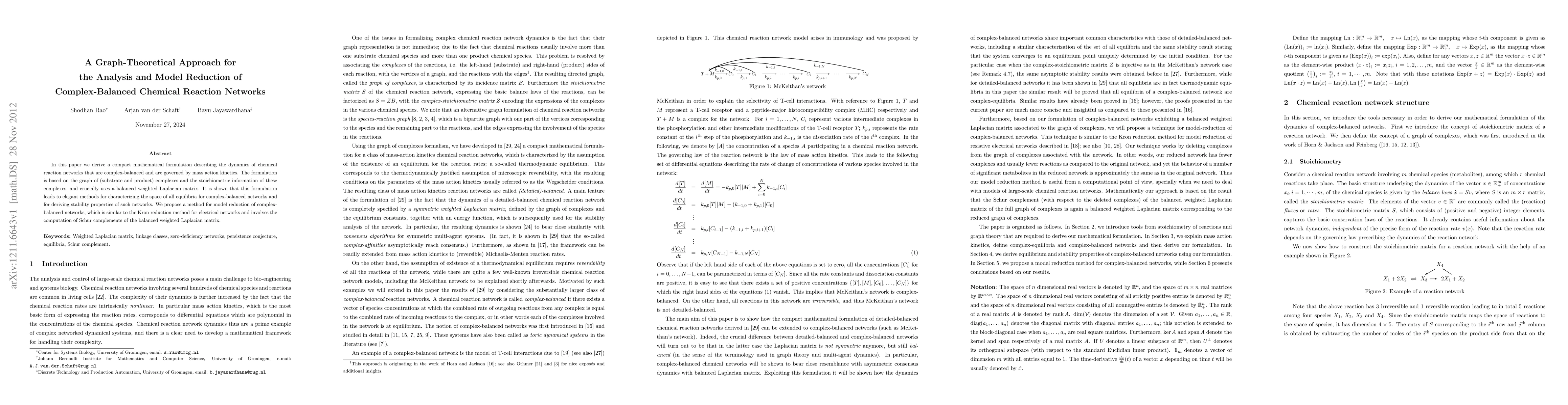 This paper presents a graph-theoretical approach to analyze and reduce complex-balanced chemical reaction networks using mass action kinetics, employing a balanced weighted Laplacian matrix and Schur complements for model reduction akin to the Kron reduction method. The method characterizes equilibria and stability properties of these networks.