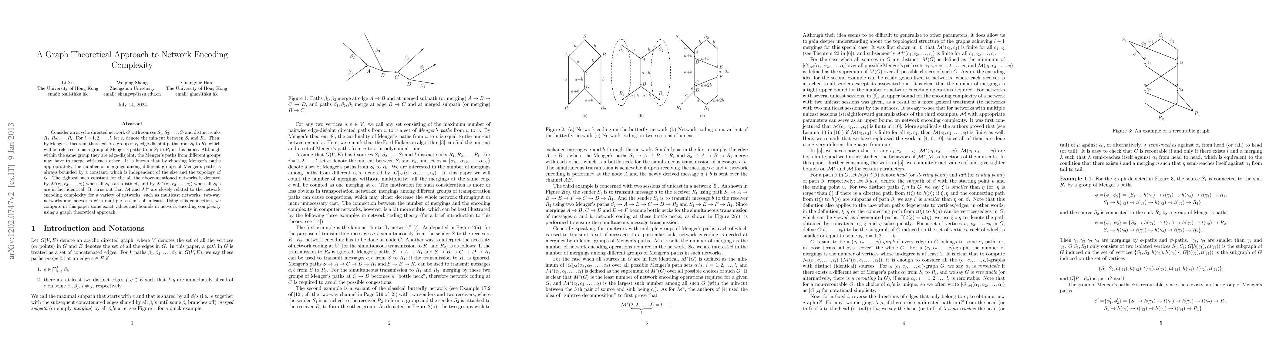 Consider an acyclic directed network $G$ with sources $S_1, S_2,..., S_l$ and distinct sinks $R_1, R_2,..., R_l$. For $i=1, 2,..., l$, let $c_i$ denote the min-cut between $S_i$ and $R_i$. Then, by Menger's theorem, there exists a group of $c_i$ edge-disjoint paths from $S_i$ to $R_i$, which will be referred to as a group of Menger's paths from $S_i$ to $R_i$ in this paper. Although within the same group they are edge-disjoint, the Menger's paths from different groups may have to merge with each other. It is known that by choosing Menger's paths appropriately, the number of mergings among different groups of Menger's paths is always bounded by a constant, which is independent of the size and the topology of $G$. The tightest such constant for the all the above-mentioned networks is denoted by $\mathcal{M}(c_1, c_2,..., c_2)$ when all $S_i$'s are distinct, and by $\mathcal{M}^*(c_1, c_2,..., c_2)$ when all $S_i$'s are in fact identical. It turns out that $\mathcal{M}$ and $\mathcal{M}^*$ are closely related to the network encoding complexity for a variety of networks, such as multicast networks, two-way networks and networks with multiple sessions of unicast. Using this connection, we compute in this paper some exact values and bounds in network encoding complexity using a graph theoretical approach.
