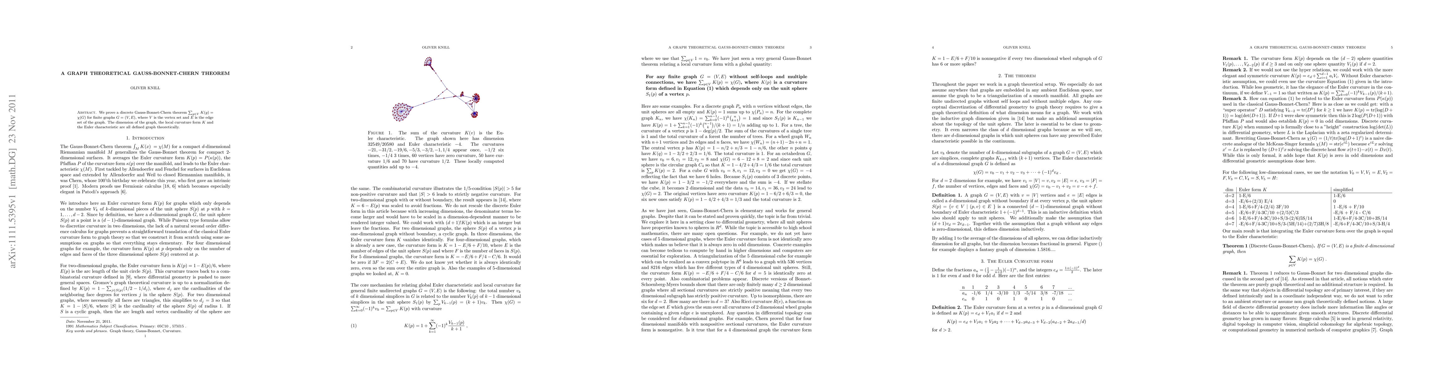 This paper proves a discrete version of the Gauss-Bonnet-Chern theorem for finite graphs, demonstrating that summing the curvature over all vertices yields the Euler characteristic of the graph.