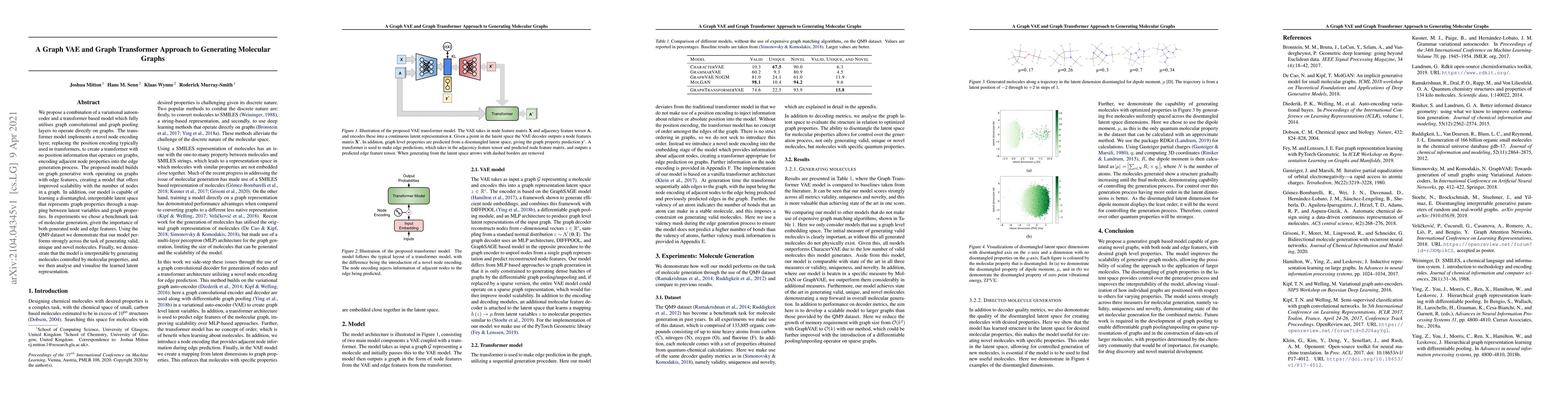 This research introduces a novel model combining a variational autoencoder and a transformer, designed to generate molecular graphs. The model, utilizing graph convolutional and pooling layers, creates a scalable, interpretable latent space for graph properties. It excels in generating unique, valid molecules using the QM9 dataset, and allows for control over molecular properties, demonstrating both strong performance and interpretability.