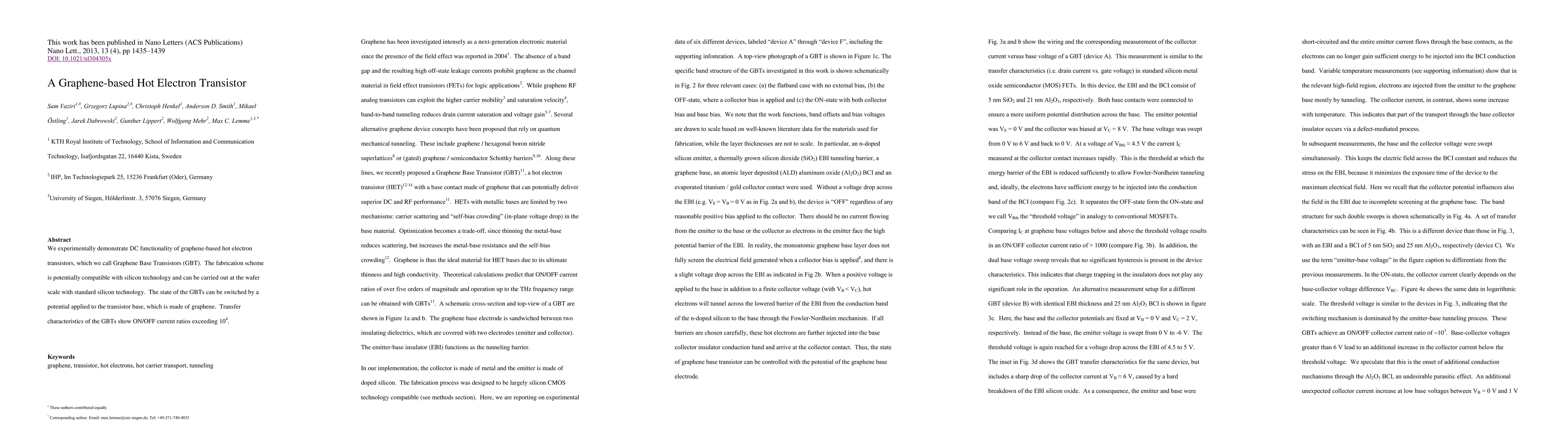 This paper demonstrates a graphene-based hot electron transistor, called Graphene Base Transistor (GBT), which exhibits DC functionality and high ON/OFF current ratios exceeding 50,000, with a fabrication process compatible with existing silicon technology.