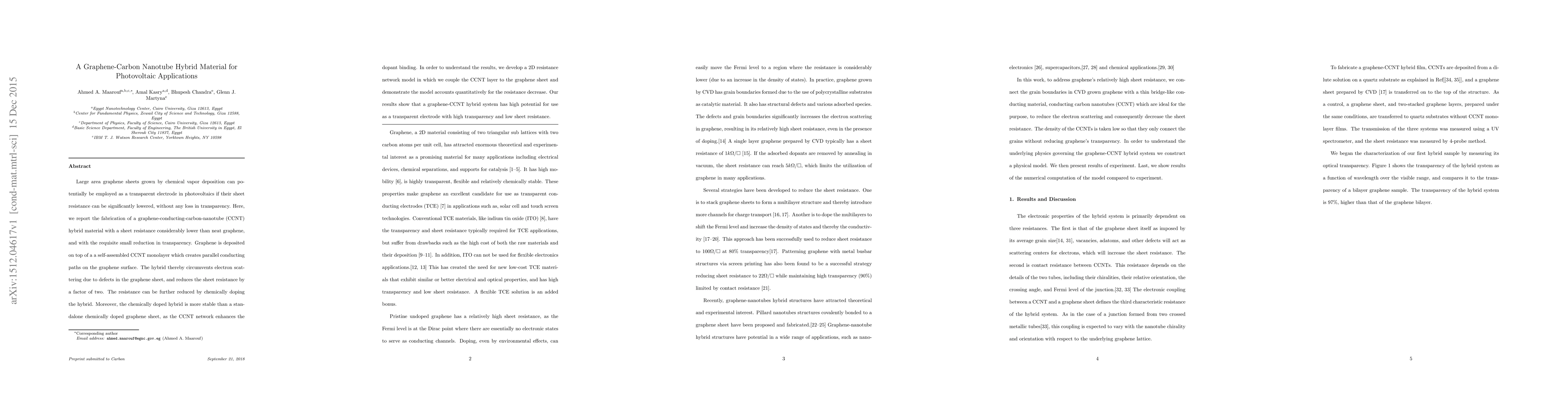 This paper reports the fabrication of a graphene-carbon nanotube hybrid material that significantly lowers sheet resistance while maintaining transparency, making it a promising transparent electrode for photovoltaic applications. The hybrid structure reduces resistance by creating parallel conducting paths and enhances dopant stability, supported by a 2D resistance network model.