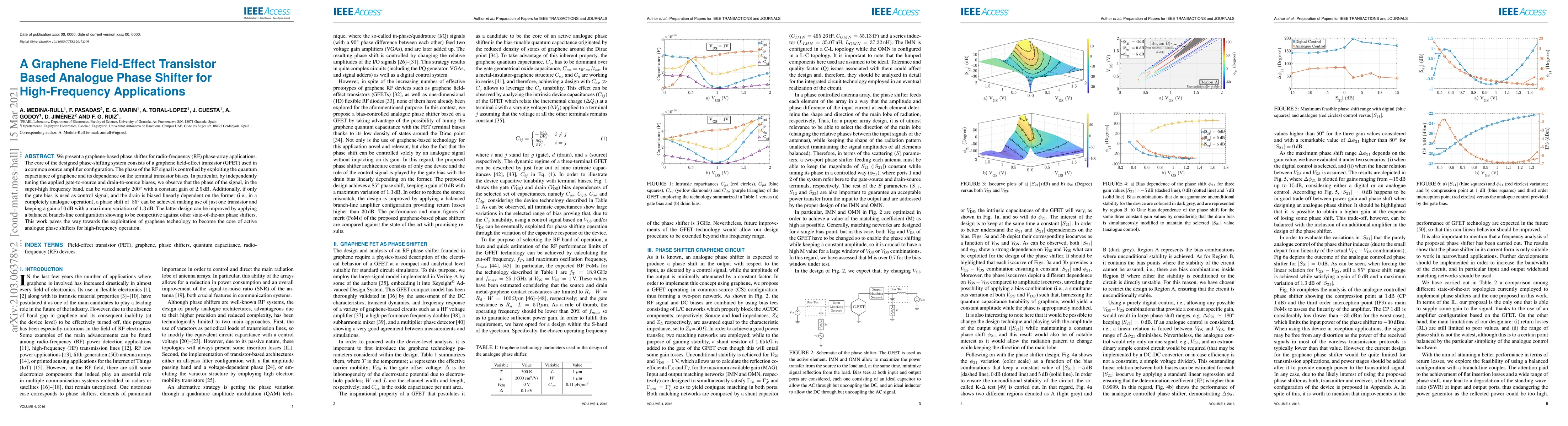 This research introduces a graphene field-effect transistor-based analogue phase shifter for high-frequency RF applications, achieving nearly 200 degrees of phase shift with a constant gain, and demonstrating a simplified design capable of 85 degrees of phase shift with minimal gain variation. The latter design is further enhanced using a balanced branch-line configuration.