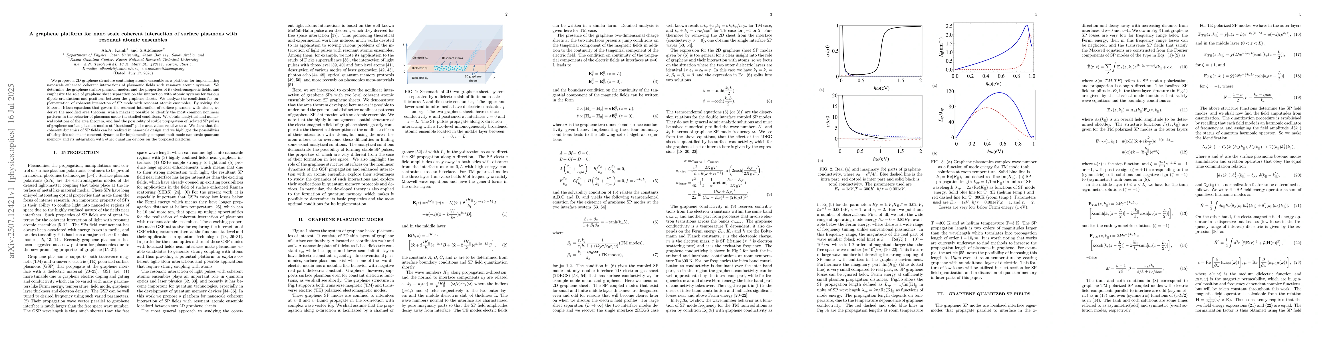 The research proposes a 2D graphene structure containing atomic ensembles as a platform for nanoscale enhanced coherent interactions of plasmonic fields with resonant atomic systems. It determines graphene surface plasmon modes and their electromagnetic fields, emphasizing the role of graphene sheet separation on interaction with atomic systems for various dipole orientations and positions.