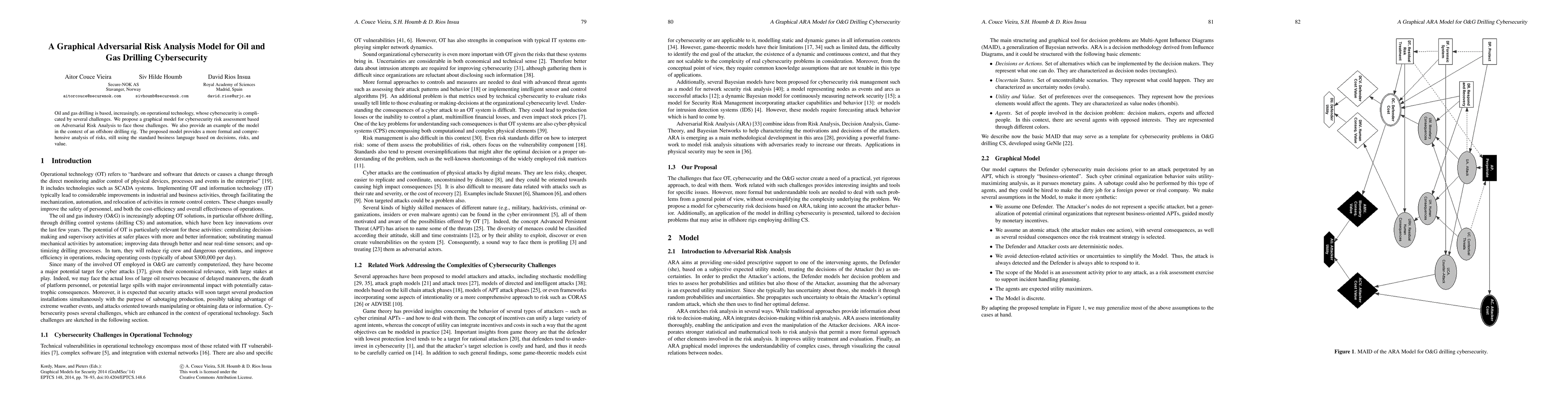 Oil and gas drilling is based, increasingly, on operational technology, whose cybersecurity is complicated by several challenges. We propose a graphical model for cybersecurity risk assessment based on Adversarial Risk Analysis to face those challenges. We also provide an example of the model in the context of an offshore drilling rig. The proposed model provides a more formal and comprehensive analysis of risks, still using the standard business language based on decisions, risks, and value.