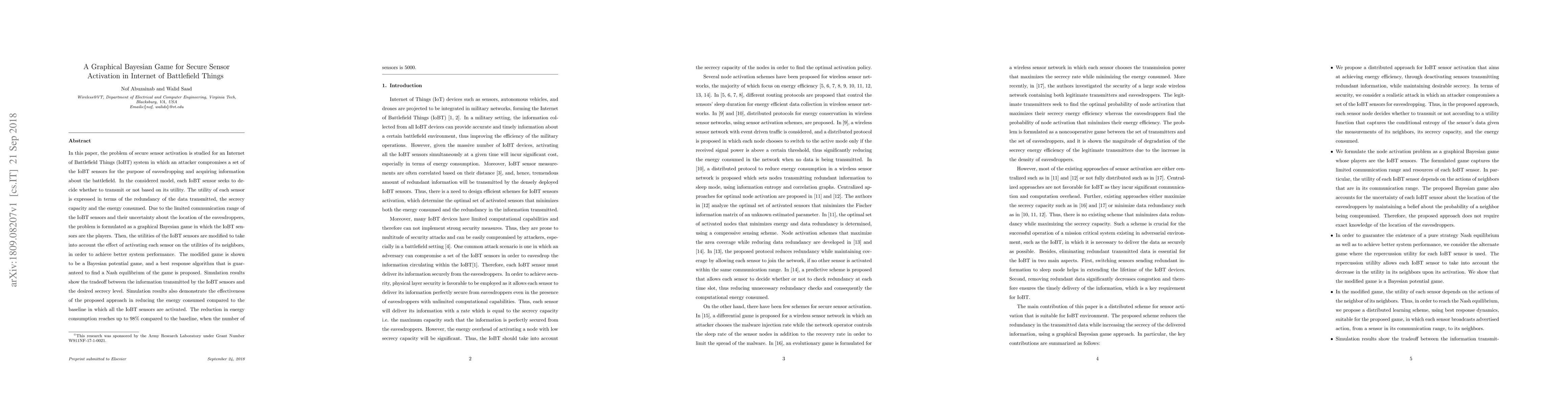 This paper proposes a graphical Bayesian game for secure sensor activation in an Internet of Battlefield Things (IoBT) system, where sensors decide on transmission based on utility factors including data redundancy, secrecy capacity, and energy consumption. The approach modifies the game to account for sensor interactions, achieving a Nash equilibrium via a best response algorithm, and demonstrates significant energy savings up to 98% compared to a baseline activation strategy.
