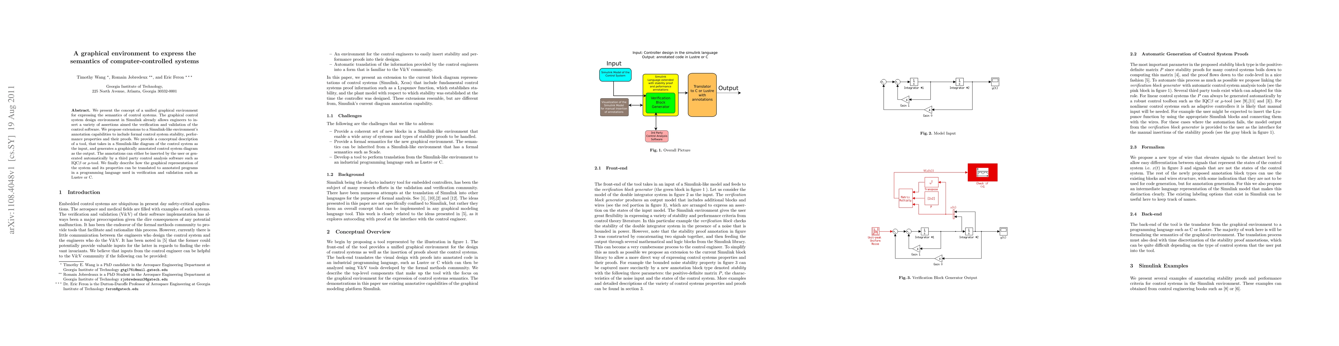 We present the concept of a unified graphical environment for expressing the semantics of control systems. The graphical control system design environment in Simulink already allows engineers to insert a variety of assertions aimed the verification and validation of the control software. We propose extensions to a Simulink-like environment's annotation capabilities to include formal control system stability, performance properties and their proofs. We provide a conceptual description of a tool, that takes in a Simulink-like diagram of the control system as the input, and generates a graphically annotated control system diagram as the output. The annotations can either be inserted by the user or generated automatically by a third party control analysis software such as IQC$\beta$ or $\mu$-tool. We finally describe how the graphical representation of the system and its properties can be translated to annotated programs in a programming language used in verification and validation such as Lustre or C.