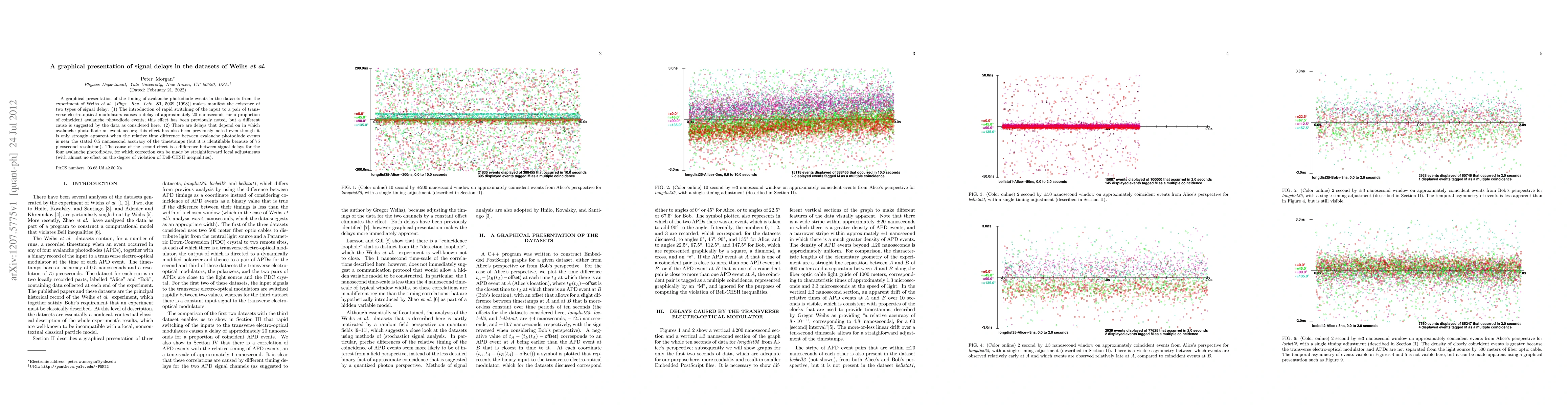 A graphical presentation of the timing of avalanche photodiode events in the datasets from the experiment of Weihs et al. [Phys. Rev. Lett. 81, 5039 (1998)] makes manifest the existence of two types of signal delay: (1) The introduction of rapid switching of the input to a pair of transverse electro-optical modulators causes a delay of approximately 20 nanoseconds for a proportion of coincident avalanche photodiode events; this effect has been previously noted, but a different cause is suggested by the data as considered here. (2) There are delays that depend on in which avalanche photodiode an event occurs; this effect has also been previously noted even though it is only strongly apparent when the relative time difference between avalanche photodiode events is near the stated 0.5 nanosecond accuracy of the timestamps (but it is identifiable because of 75 picosecond resolution). The cause of the second effect is a difference between signal delays for the four avalanche photodiodes, for which correction can be made by straightforward local adjustments (with almost no effect on the degree of violation of Bell-CHSH inequalities).
