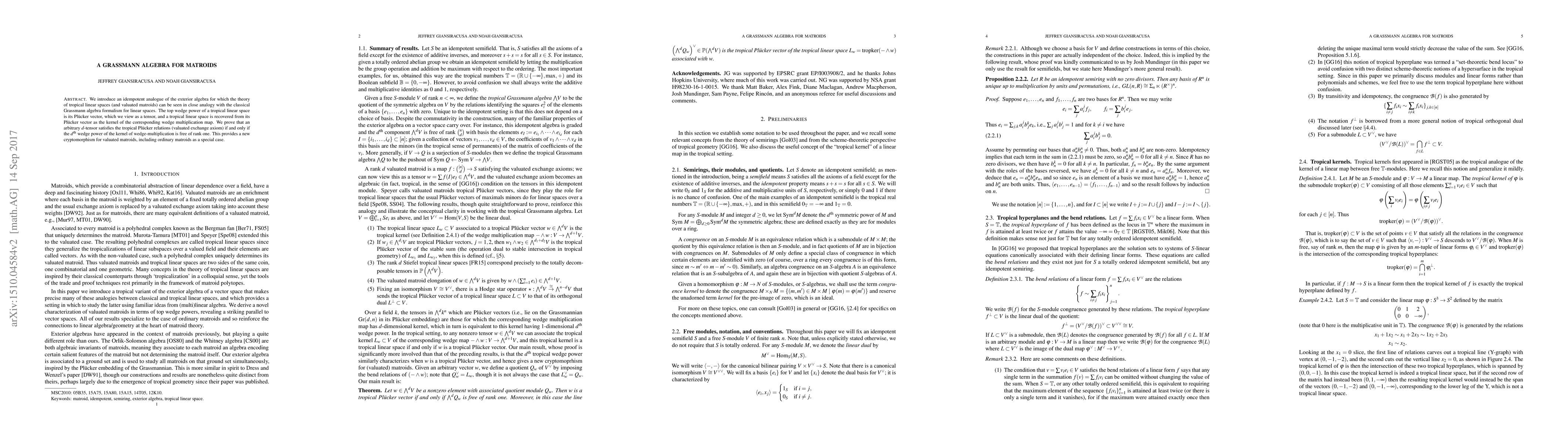 Researchers introduce a Grassmann algebra for matroids, linking tropical linear spaces to classical formalism through Plucker vectors and wedge power, offering a new cryptomorphism for valuated matroids.