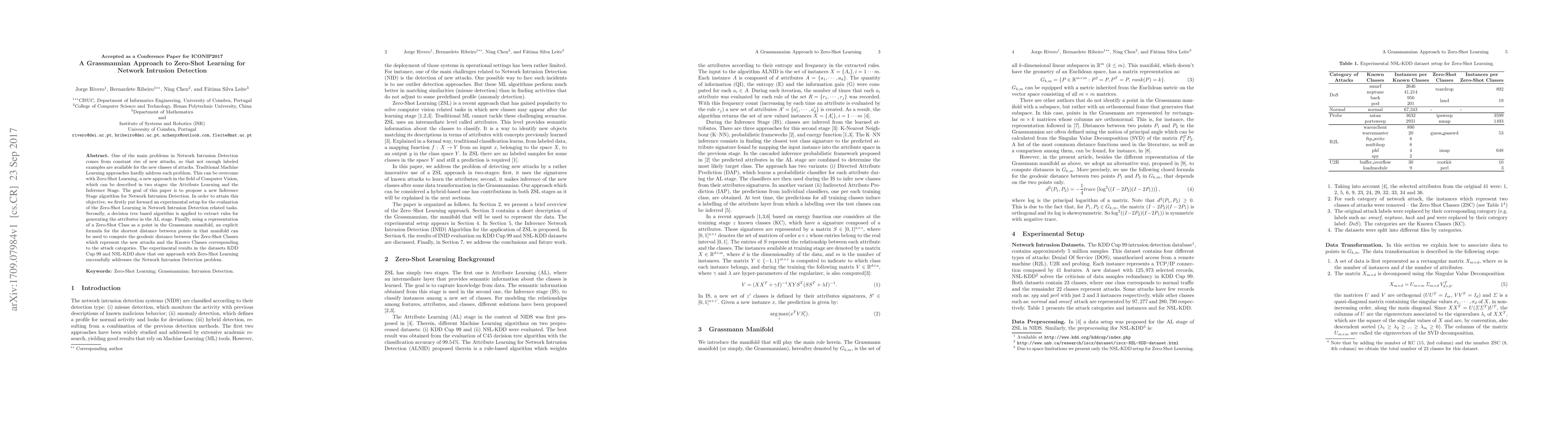 One of the main problems in Network Intrusion Detection comes from constant rise of new attacks, so that not enough labeled examples are available for the new classes of attacks. Traditional Machine Learning approaches hardly address such problem. This can be overcome with Zero-Shot Learning, a new approach in the field of Computer Vision, which can be described in two stages: the Attribute Learning and the Inference Stage. The goal of this paper is to propose a new Inference Stage algorithm for Network Intrusion Detection. In order to attain this objective, we firstly put forward an experimental setup for the evaluation of the Zero-Shot Learning in Network Intrusion Detection related tasks. Secondly, a decision tree based algorithm is applied to extract rules for generating the attributes in the AL stage. Finally, using a representation of a Zero-Shot Class as a point in the Grassmann manifold, an explicit formula for the shortest distance between points in that manifold can be used to compute the geodesic distance between the Zero-Shot Classes which represent the new attacks and the Known Classes corresponding to the attack categories. The experimental results in the datasets KDD Cup 99 and NSL-KDD show that our approach with Zero-Shot Learning successfully addresses the Network Intrusion Detection problem.