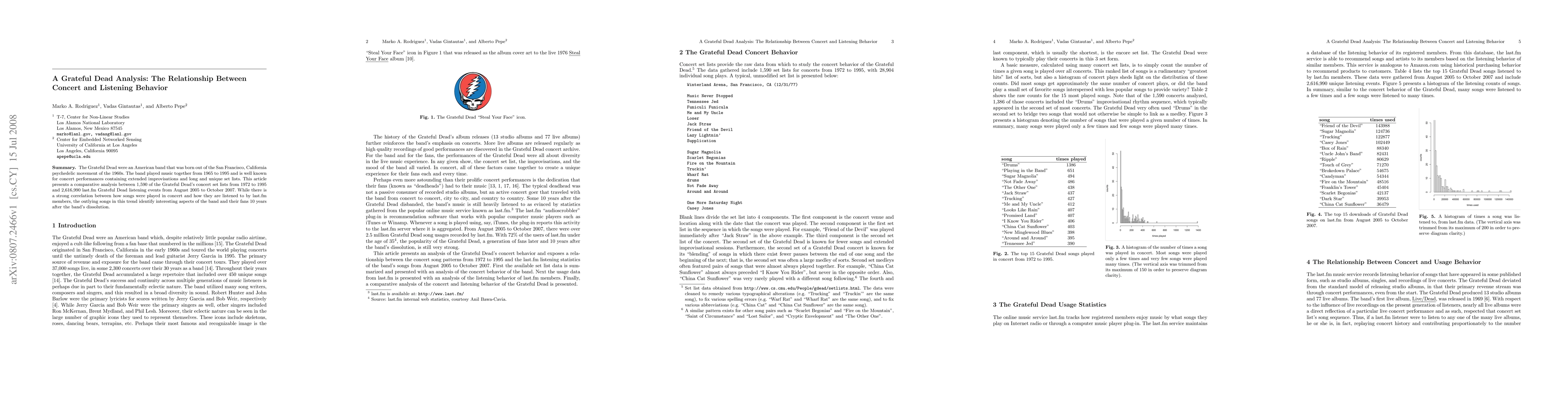 This paper analyzes the relationship between Grateful Dead concert performances and listening behavior, comparing 1,590 concert set lists from 1972 to 1995 with 2,616,990 listening events from last.fm. It finds a strong correlation between concert and listening preferences, highlighting unique aspects of the band's legacy and fan behavior post-dissolution.