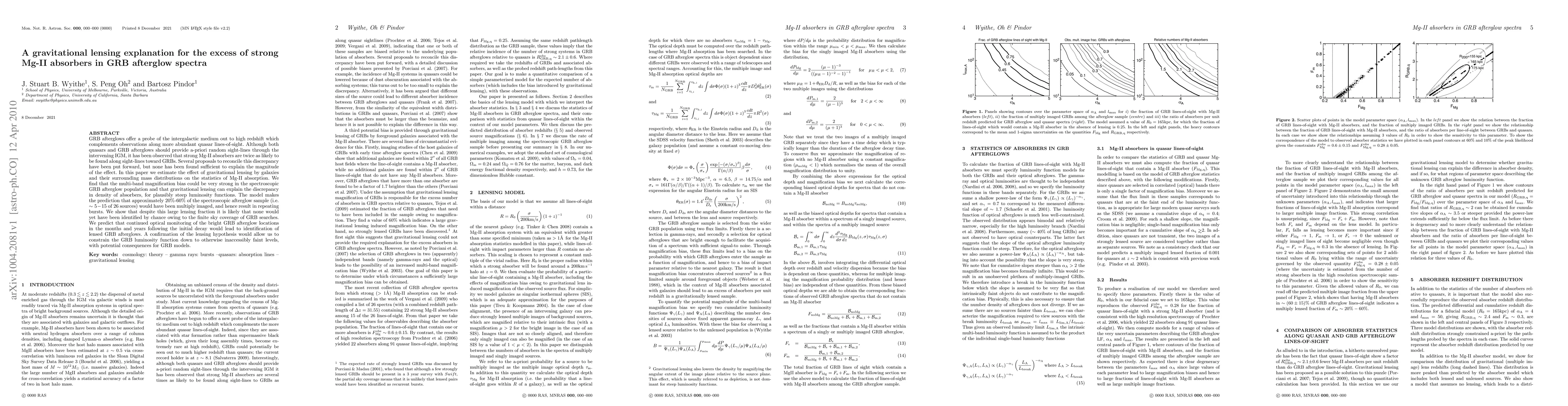 This paper explores how gravitational lensing by galaxies can explain the higher-than-expected density of strong Mg-II absorbers along sight-lines toward GRB afterglows. The authors propose that lensing magnification bias could account for the observed discrepancy, suggesting that 20%-60% of GRB afterglows might be multiply imaged, though none have been identified yet due to limited sky coverage.