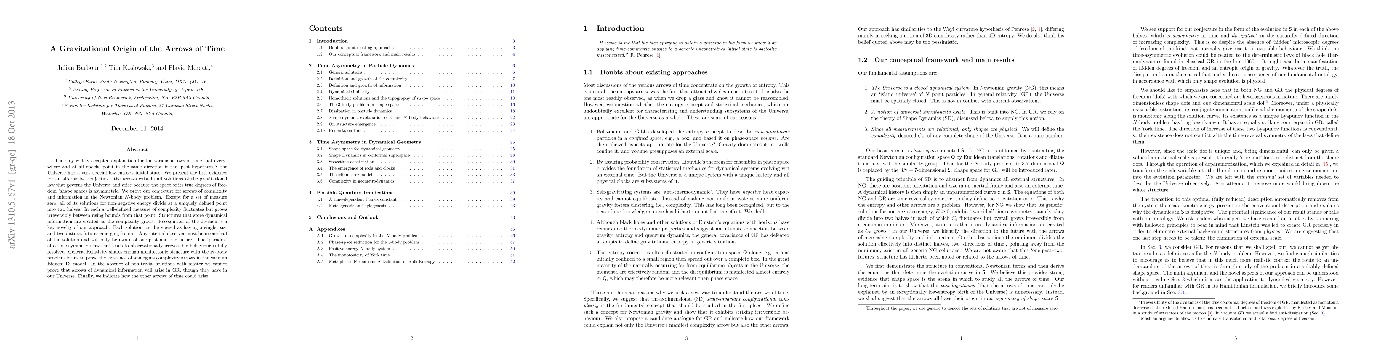 The only widely accepted explanation for the various arrows of time that everywhere and at all epochs point in the same direction is the `past hypothesis': the Universe had a very special low-entropy initial state. We present the first evidence for an alternative conjecture: the arrows exist in all solutions of the gravitational law that governs the Universe and arise because the space of its true degrees of freedom (shape space) is asymmetric. We prove our conjecture for arrows of complexity and information in the Newtonian N-body problem. Except for a set of measure zero, all of its solutions for non-negative energy divide at a uniquely defined point into two halves. In each a well-defined measure of complexity fluctuates but grows irreversibly between rising bounds from that point. Structures that store dynamical information are created as the complexity grows. Recognition of the division is a key novelty of our approach. Each solution can be viewed as having a single past and two distinct futures emerging from it. Any internal observer must be in one half of the solution and will only be aware of one past and one future. The `paradox' of a time-symmetric law that leads to observationally irreversible behaviour is fully resolved. General Relativity shares enough architectonic structure with the N-body problem for us to prove the existence of analogous complexity arrows in the vacuum Bianchi IX model. In the absence of non-trivial solutions with matter we cannot prove that arrows of dynamical information will arise in GR, though they have in our Universe. Finally, we indicate how the other arrows of time could arise.