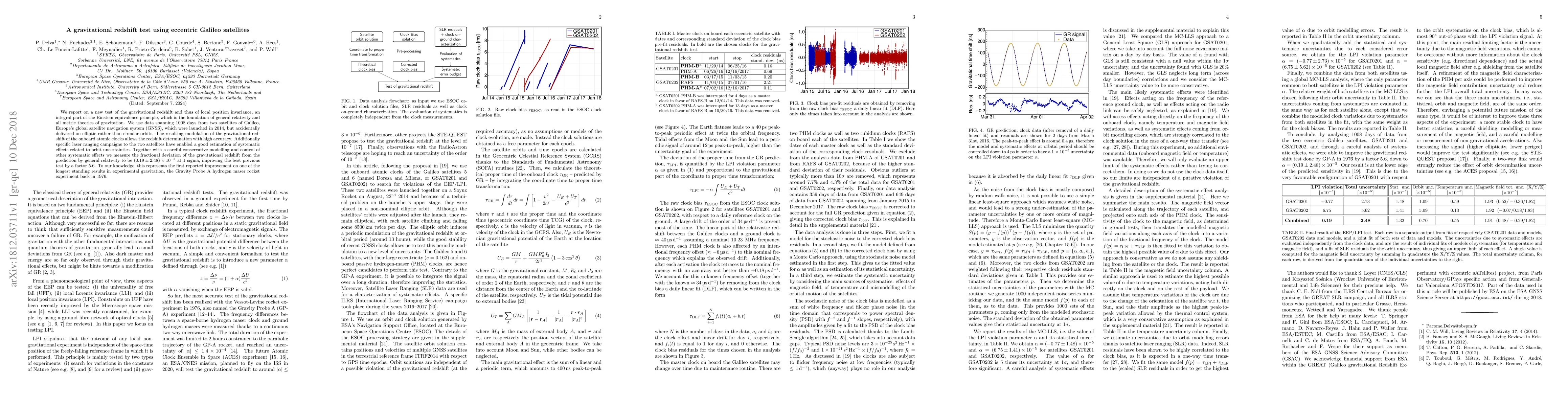 We report on a new test of the gravitational redshift and thus of local position invariance, an integral part of the Einstein equivalence principle, which is the foundation of general relativity and all metric theories of gravitation. We use data spanning 1008 days from two satellites of Galileo, Europe's global satellite navigation system (GNSS), which were launched in 2014, but accidentally delivered on elliptic rather than circular orbits. The resulting modulation of the gravitational redshift of the onboard atomic clocks allows the redshift determination with high accuracy. Additionally specific laser ranging campaigns to the two satellites have enabled a good estimation of systematic effects related to orbit uncertainties. Together with a careful conservative modelling and control of other systematic effects we measure the fractional deviation of the gravitational redshift from the prediction by general relativity to be $(+0.19 \pm 2.48)\times10^{-5}$ at 1 sigma, improving the best previous test by a factor~5.6. To our knowledge, this represents the first reported improvement on one of the longest standing results in experimental gravitation, the Gravity Probe A hydrogen maser rocket experiment back in 1976.