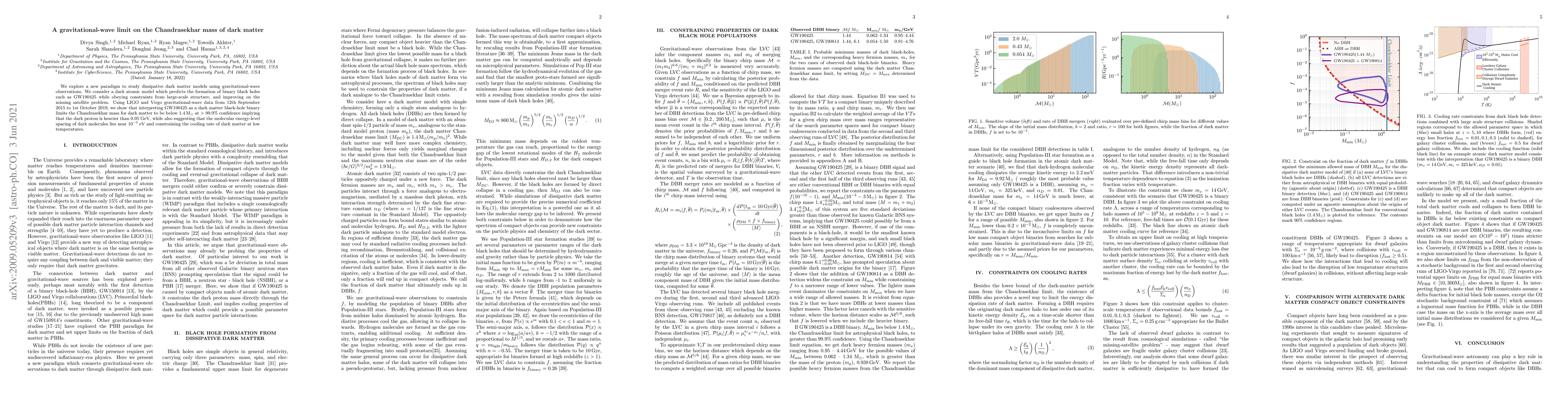 We explore a new paradigm to study dissipative dark matter models using gravitational-wave observations. We consider a dark atomic model which predicts the formation of binary black holes such as GW190425 while obeying constraints from large-scale structure, and improving on the missing satellite problem. Using LIGO and Virgo gravitational-wave data from 12th September 2015 to 1st October 2019, we show that interpreting GW190425 as a dark matter black-hole binary limits the Chandrasekhar mass for dark matter to be below 1.4 $M_\odot$ at $> 99.9\%$ confidence implying that the dark proton is heavier than 0.95 GeV, while also suggesting that the molecular energy-level spacing of dark molecules lies near $10^{-3}$ eV and constraining the cooling rate of dark matter at low temperatures.
