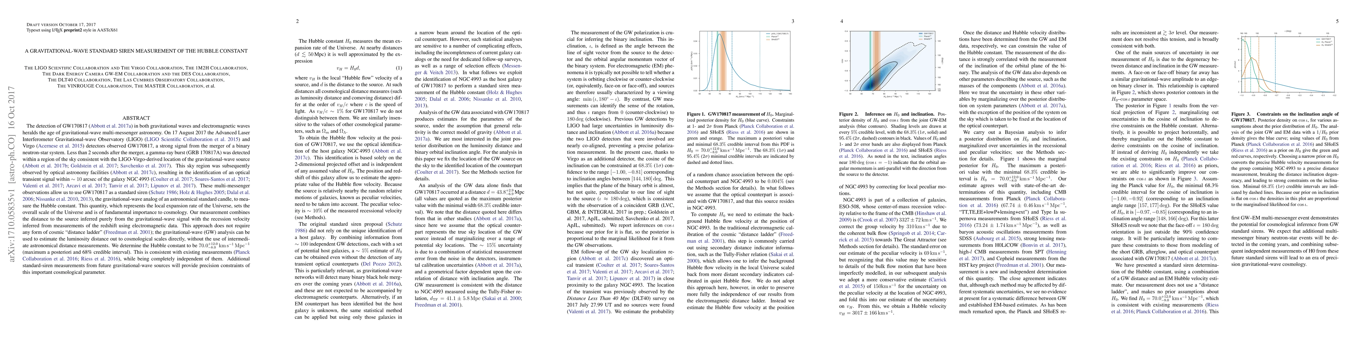 This paper reports the first measurement of the Hubble constant using gravitational waves from the neutron-star merger GW170817, termed a "standard siren." Combining gravitational-wave and electromagnetic data, the authors determine the Hubble constant to be $70.0^{+12.0}_{-8.0} \, \mathrm{km} \, \mathrm{s}^{-1} \, \mathrm{Mpc}^{-1}$, providing an independent, multi-messenger method for cosmological parameter estimation.