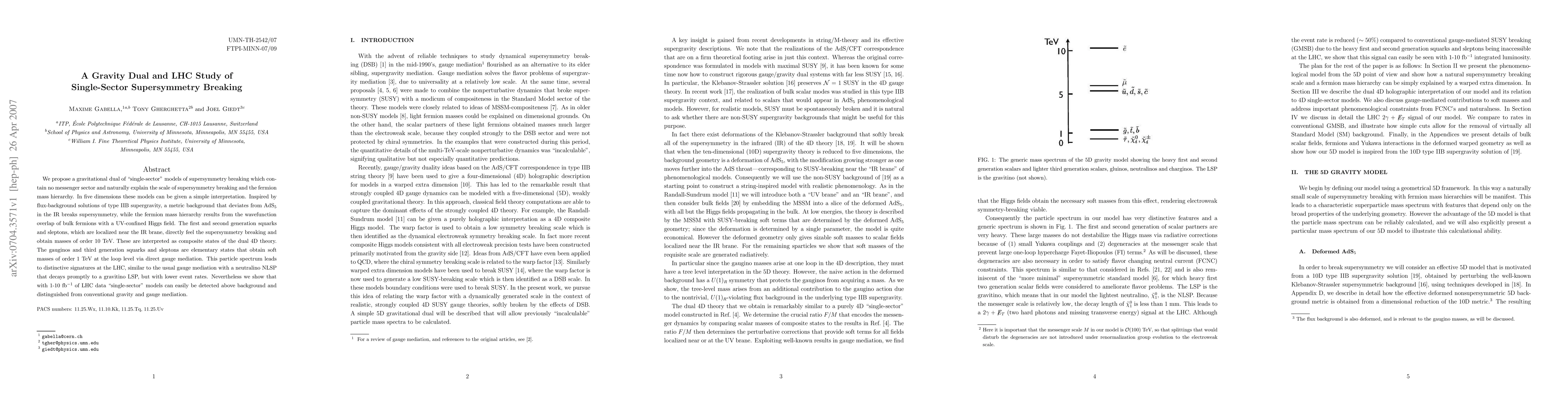 This paper proposes a gravitational dual for "single-sector" supersymmetry breaking models, explaining the scale of breaking and fermion mass hierarchy without a messenger sector. It predicts distinctive LHC signatures with lower event rates but still detectable with sufficient data, distinguishing it from conventional gravity and gauge mediation.