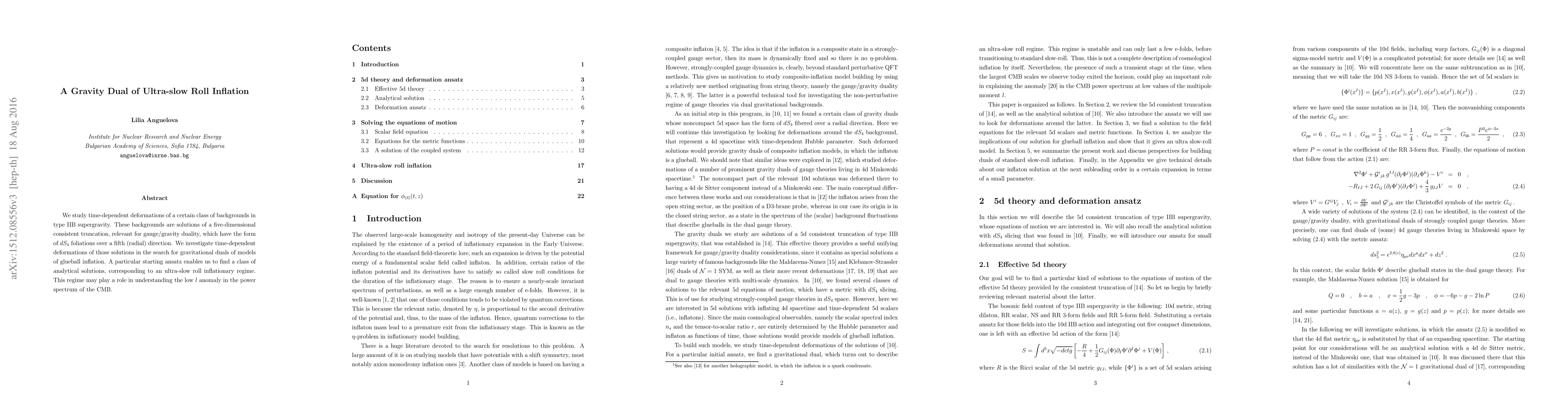 This paper explores time-dependent deformations in type IIB supergravity to find gravitational duals of ultra-slow roll inflation models, potentially explaining the low l anomaly in the CMB power spectrum. Analytical solutions corresponding to this inflationary regime are derived from a specific starting ansatz.