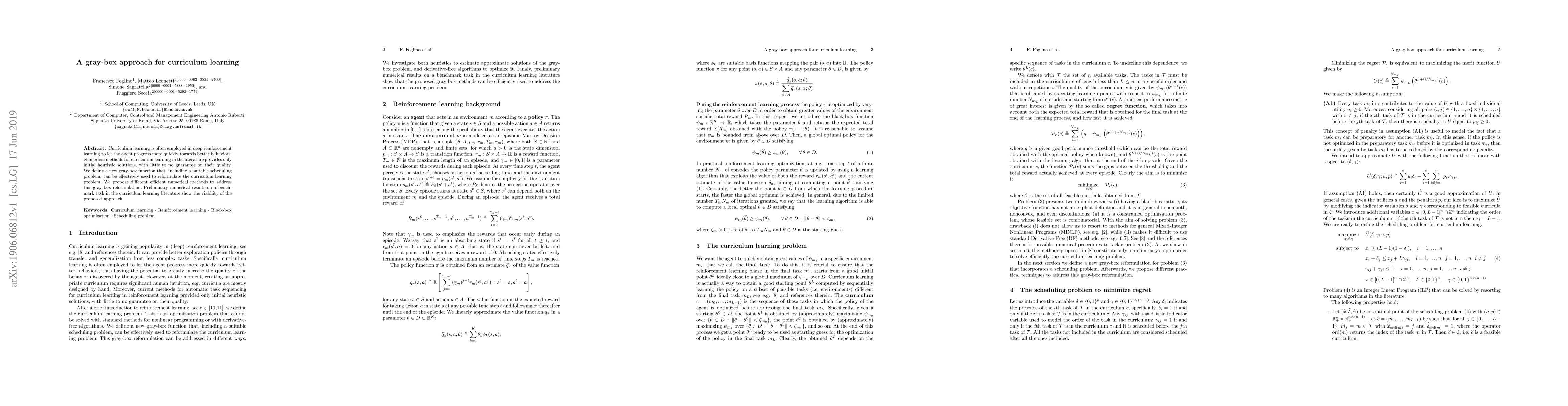 Curriculum learning is often employed in deep reinforcement learning to let the agent progress more quickly towards better behaviors. Numerical methods for curriculum learning in the literature provides only initial heuristic solutions, with little to no guarantee on their quality. We define a new gray-box function that, including a suitable scheduling problem, can be effectively used to reformulate the curriculum learning problem. We propose different efficient numerical methods to address this gray-box reformulation. Preliminary numerical results on a benchmark task in the curriculum learning literature show the viability of the proposed approach.