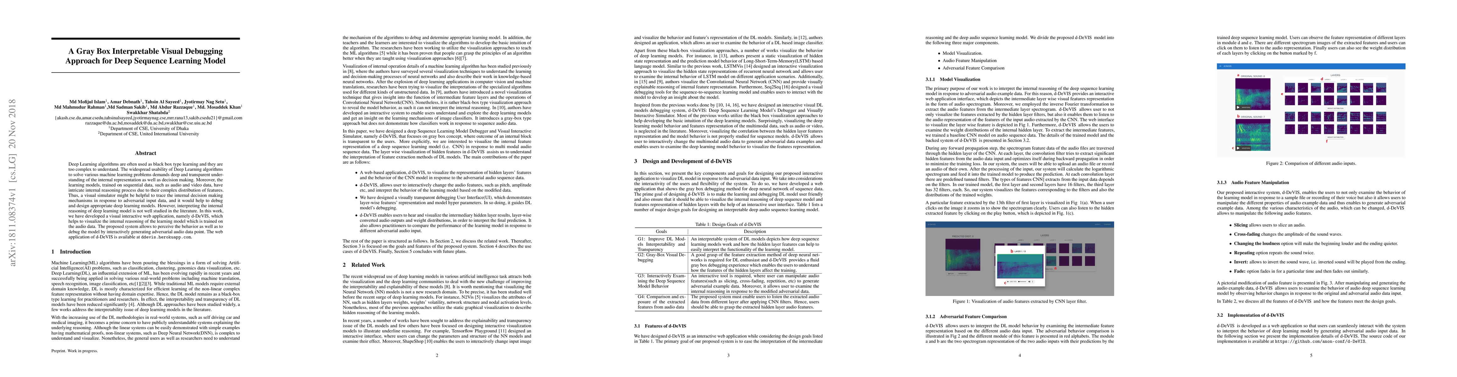 Deep Learning algorithms are often used as black box type learning and they are too complex to understand. The widespread usability of Deep Learning algorithms to solve various machine learning problems demands deep and transparent understanding of the internal representation as well as decision making. Moreover, the learning models, trained on sequential data, such as audio and video data, have intricate internal reasoning process due to their complex distribution of features. Thus, a visual simulator might be helpful to trace the internal decision making mechanisms in response to adversarial input data, and it would help to debug and design appropriate deep learning models. However, interpreting the internal reasoning of deep learning model is not well studied in the literature. In this work, we have developed a visual interactive web application, namely d-DeVIS, which helps to visualize the internal reasoning of the learning model which is trained on the audio data. The proposed system allows to perceive the behavior as well as to debug the model by interactively generating adversarial audio data point. The web application of d-DeVIS is available at ddevis.herokuapp.com.