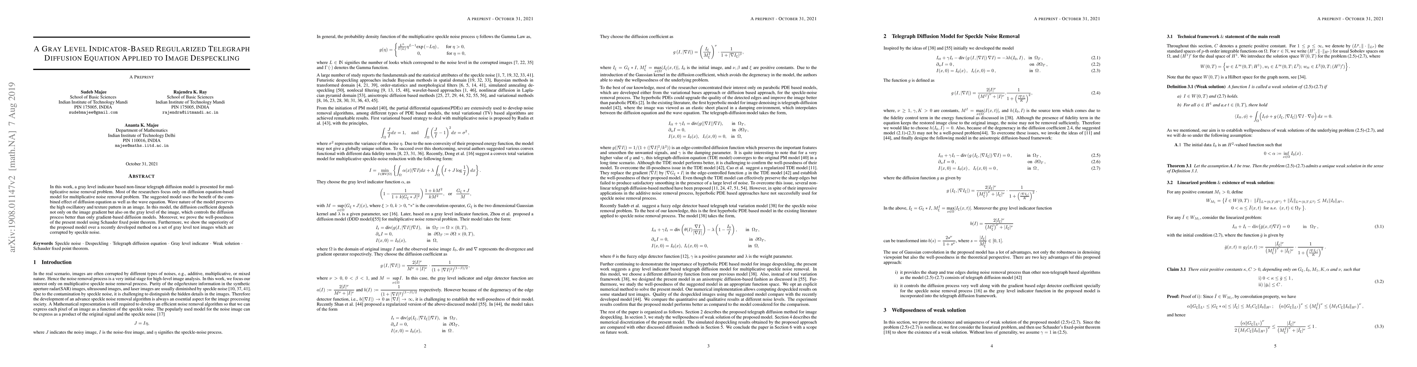 In this work, a gray level indicator based non-linear telegraph diffusion model is presented for multiplicative noise removal problem. Most of the researchers focus only on diffusion equation-based model for multiplicative noise removal problem. The suggested model uses the benefit of the combined effect of diffusion equation as well as the wave equation. Wave nature of the model preserves the high oscillatory and texture pattern in an image. In this model, the diffusion coefficient depends not only on the image gradient but also on the gray level of the image, which controls the diffusion process better than only gradient-based diffusion models. Moreover, we prove the well-posedness of the present model using Schauder fixed point theorem. Furthermore, we show the superiority of the proposed model over a recently developed method on a set of gray level test images which are corrupted by speckle noise.