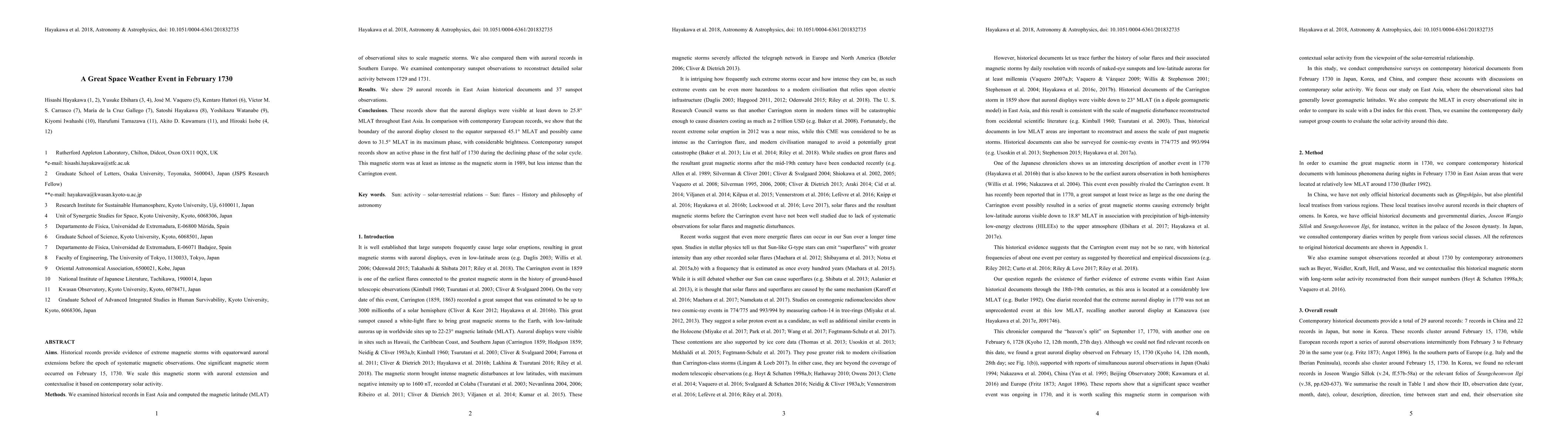 This paper examines a significant magnetic storm in February 1730, using historical records from East Asia and sunspot observations to contextualize its intensity. The storm's auroral displays extended to unprecedented low latitudes, comparable to the 1989 storm but less intense than the Carrington event.