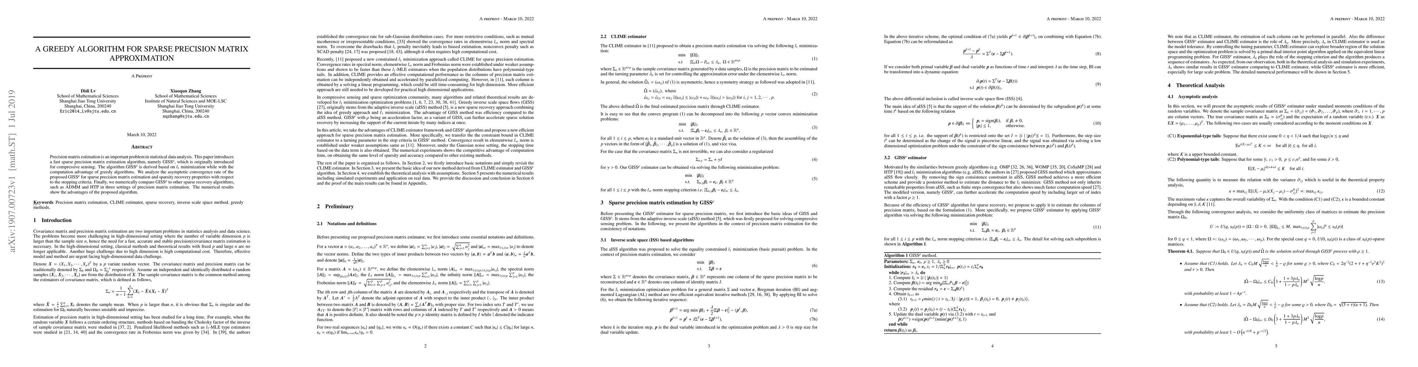 This paper proposes GISS$^{{\rho}}$, a fast greedy algorithm for sparse precision matrix estimation based on $l_1$ minimization, and analyzes its asymptotic convergence and sparsity recovery properties. Numerical comparisons show GISS$^{{\rho}}$ outperforms other methods like ADMM and HTP in precision matrix estimation.