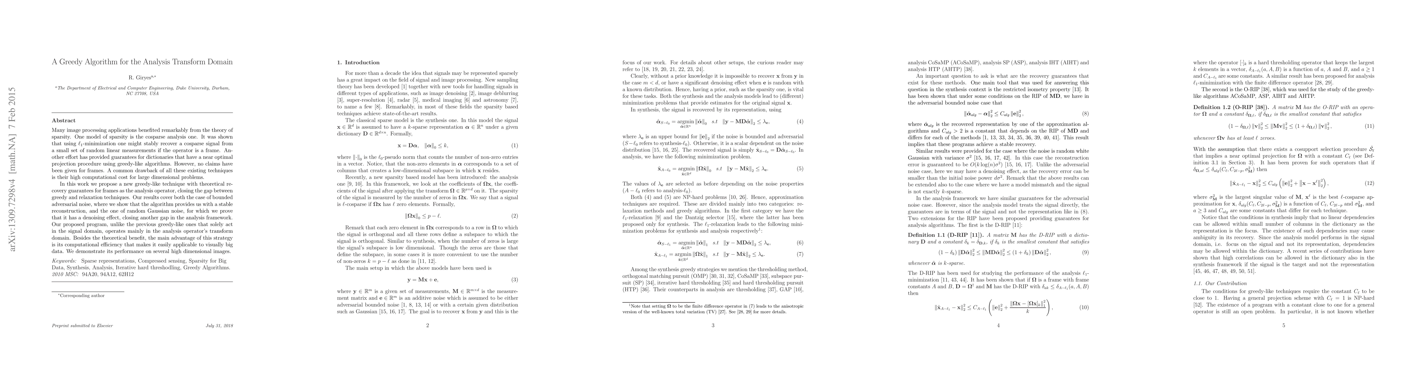 Many image processing applications benefited remarkably from the theory of sparsity. One model of sparsity is the cosparse analysis one. It was shown that using l_1-minimization one might stably recover a cosparse signal from a small set of random linear measurements if the operator is a frame. Another effort has provided guarantees for dictionaries that have a near optimal projection procedure using greedy-like algorithms. However, no claims have been given for frames. A common drawback of all these existing techniques is their high computational cost for large dimensional problems. In this work we propose a new greedy-like technique with theoretical recovery guarantees for frames as the analysis operator, closing the gap between greedy and relaxation techniques. Our results cover both the case of bounded adversarial noise, where we show that the algorithm provides us with a stable reconstruction, and the one of random Gaussian noise, for which we prove that it has a denoising effect, closing another gap in the analysis framework. Our proposed program, unlike the previous greedy-like ones that solely act in the signal domain, operates mainly in the analysis operator's transform domain. Besides the theoretical benefit, the main advantage of this strategy is its computational efficiency that makes it easily applicable to visually big data. We demonstrate its performance on several high dimensional images.