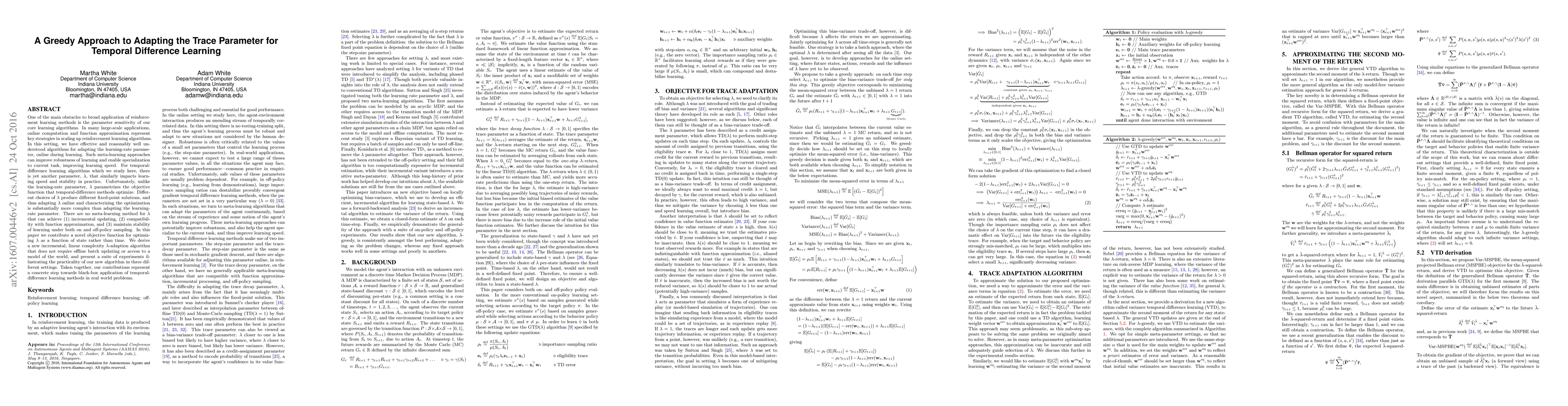 This paper proposes a novel greedy approach for dynamically adapting the trace parameter $\lambda$ in temporal-difference learning algorithms, addressing its complexity compared to learning-rate adaptation. The method introduces an incremental algorithm that maintains stability and compatibility with function approximation, facilitating broader application of reinforcement learning in large-scale problems.