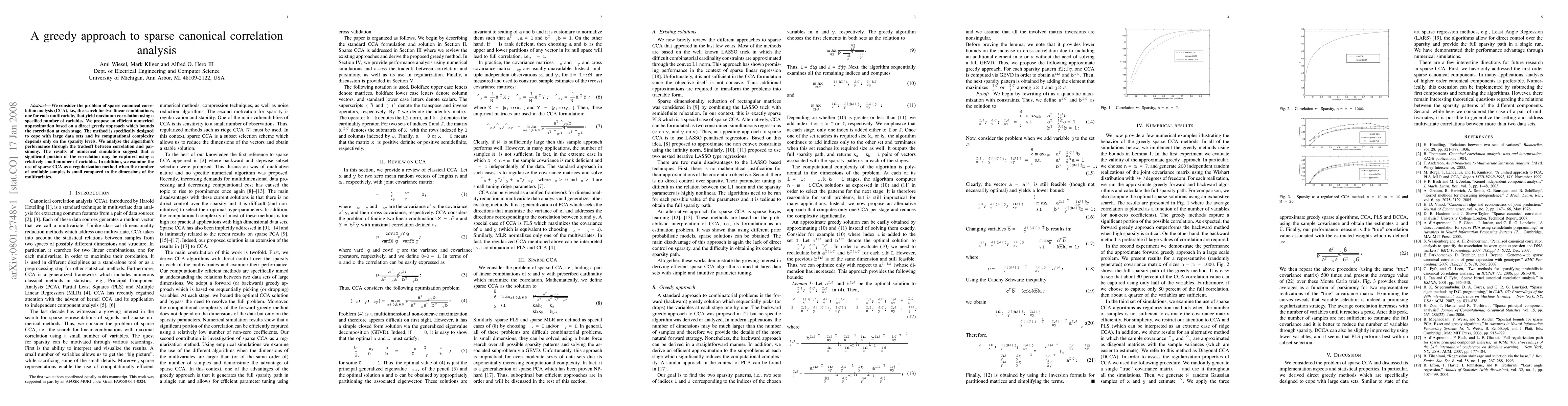 This paper proposes a greedy approach to sparse canonical correlation analysis, which efficiently finds maximum correlation between two linear combinations using a limited number of variables. It shows that a significant portion of the correlation can be captured with just a few variables, making it suitable for large datasets and sparse data.