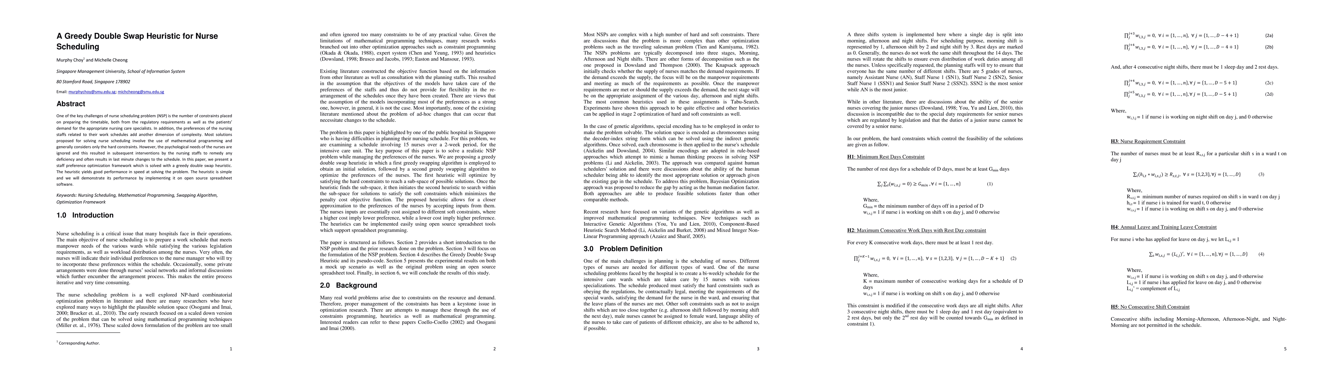 This paper proposes a greedy double swap heuristic to optimize nurse scheduling by considering both regulatory constraints and staff preferences, aiming to reduce last-minute changes and improve schedule adherence. The heuristic is implemented in open source spreadsheet software, demonstrating its efficiency and effectiveness.