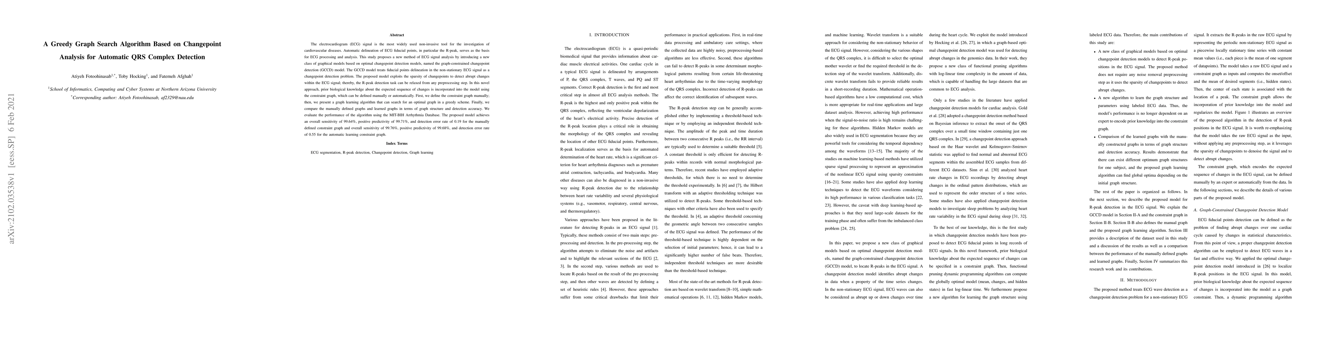 The electrocardiogram (ECG) signal is the most widely used non-invasive tool for the investigation of cardiovascular diseases. Automatic delineation of ECG fiducial points, in particular the R-peak, serves as the basis for ECG processing and analysis. This study proposes a new method of ECG signal analysis by introducing a new class of graphical models based on optimal changepoint detection models, named the graph-constrained changepoint detection (GCCD) model. The GCCD model treats fiducial points delineation in the non-stationary ECG signal as a changepoint detection problem. The proposed model exploits the sparsity of changepoints to detect abrupt changes within the ECG signal; thereby, the R-peak detection task can be relaxed from any preprocessing step. In this novel approach, prior biological knowledge about the expected sequence of changes is incorporated into the model using the constraint graph, which can be defined manually or automatically. First, we define the constraint graph manually; then, we present a graph learning algorithm that can search for an optimal graph in a greedy scheme. Finally, we compare the manually defined graphs and learned graphs in terms of graph structure and detection accuracy. We evaluate the performance of the algorithm using the MIT-BIH Arrhythmia Database. The proposed model achieves an overall sensitivity of 99.64%, positive predictivity of 99.71%, and detection error rate of 0.19 for the manually defined constraint graph and overall sensitivity of 99.76%, positive predictivity of 99.68%, and detection error rate of 0.55 for the automatic learning constraint graph.