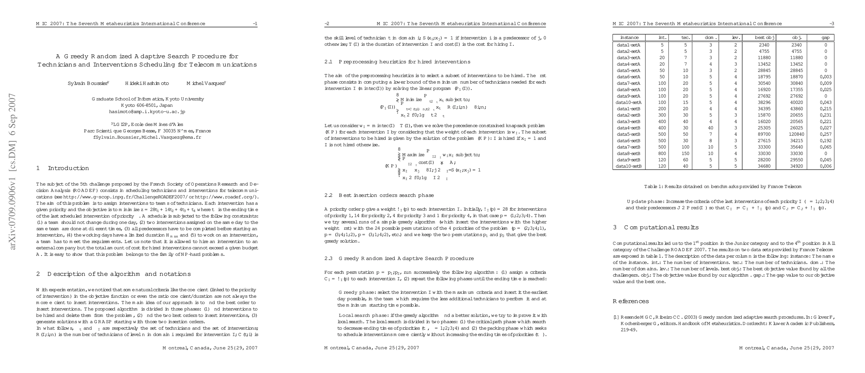This research paper presents a new algorithm called GRASP for scheduling technicians and interventions in telecommunications, which achieved 1st place in the Junior category and 4th place overall at the ROADEF 2007 challenge.