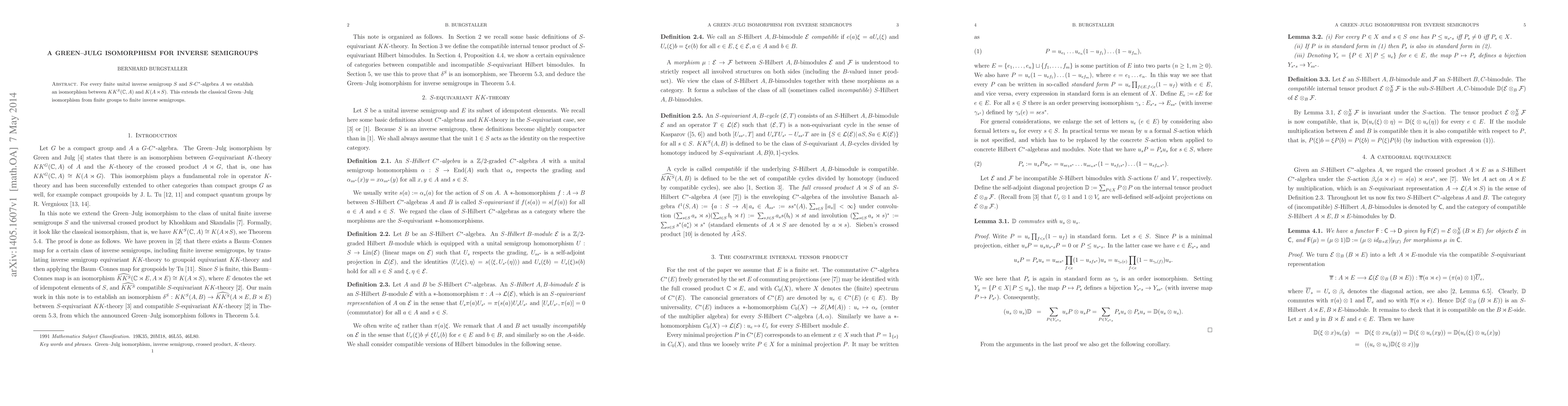 This paper establishes an isomorphism between $KK^S(\mathbb{C},A)$ and $K(A \rtimes S)$ for any finite unital inverse semigroup $S$ and $S$-$C^*$-algebra $A$, extending the classical Green--Julg isomorphism from finite groups to inverse semigroups.