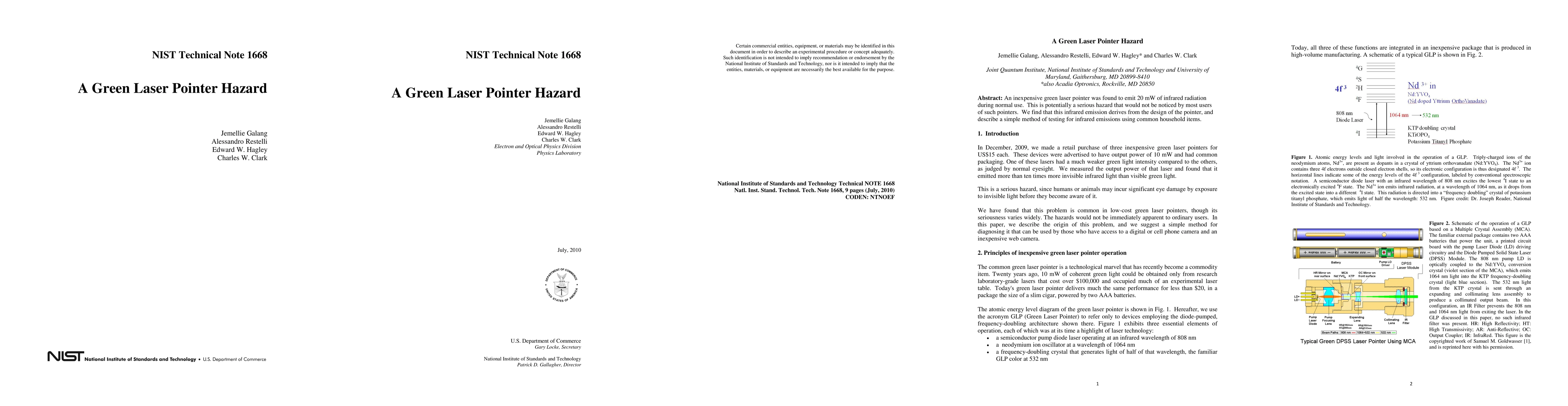 A study found that inexpensive green laser pointers emit 20mW of infrared radiation, posing a serious hazard to users, and proposed a simple method for testing for infrared emissions using common household items.
