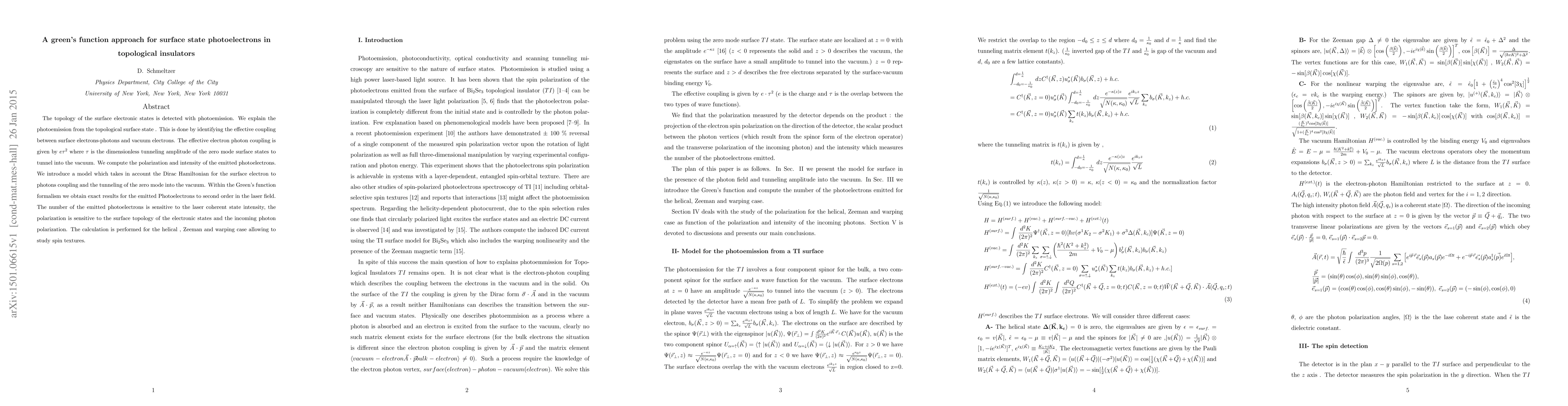 This paper uses a Green's function approach to analyze photoemission from topological insulators, focusing on the coupling between surface electrons and photons. The study reveals how the intensity and polarization of emitted photoelectrons depend on the laser field and the surface electronic state topology.