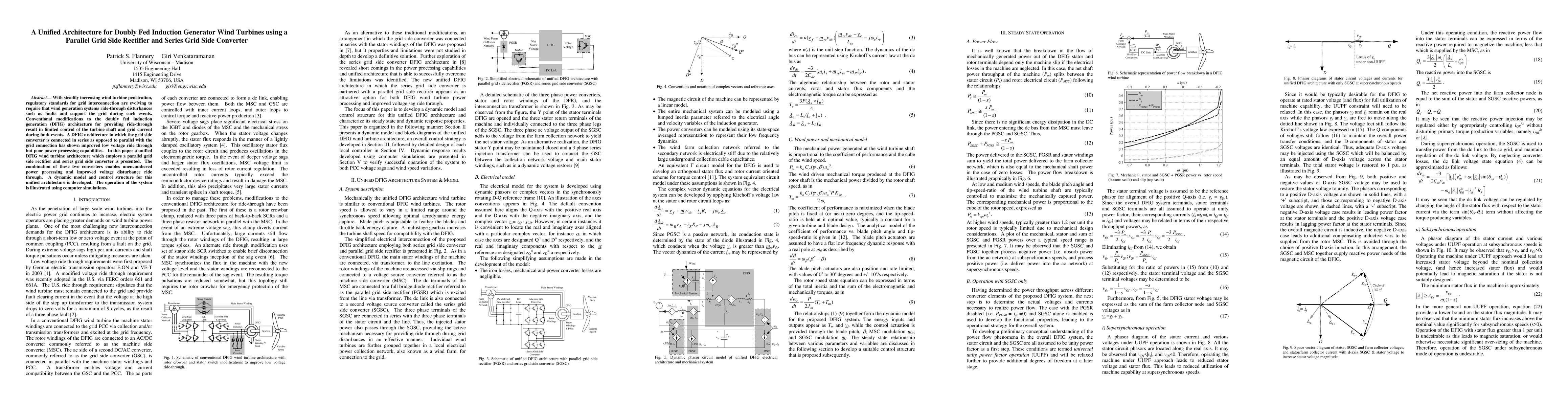 With steadily increasing wind turbine penetration, regulatory standards for grid interconnection are evolving to require that wind generation systems ride-through disturbances such as faults and support the grid during such events. Conventional modifications to the doubly fed induction generation (DFIG) architecture for providing ride-through result in limited control of the turbine shaft and grid current during fault events. A DFIG architecture in which the grid side converter is connected in series as opposed to parallel with the grid connection has shown improved low voltage ride through but poor power processing capabilities. In this paper a unified DFIG wind turbine architecture which employs a parallel grid side rectifier and series grid side converter is presented. The combination of these two converters enables unencumbered power processing and improved voltage disturbance ride through. A dynamic model and control structure for this unified architecture is developed. The operation of the system is illustrated using computer simulations.