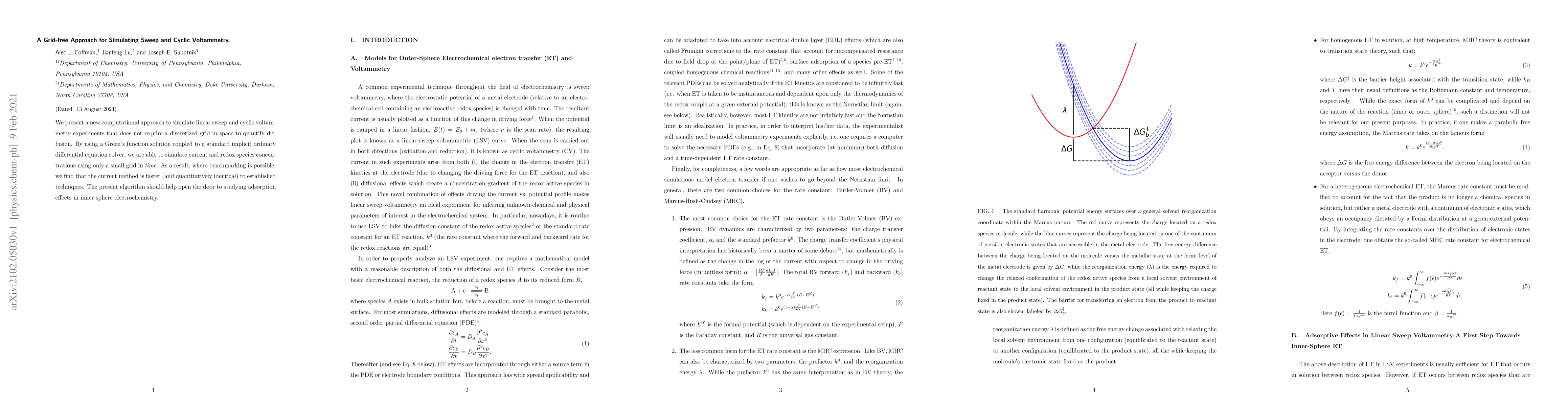 This research introduces a novel, grid-free method to simulate linear sweep and cyclic voltammetry experiments, utilizing Green's function and a time-sparse grid. It outperforms established techniques in speed and accuracy, facilitating the study of adsorption in inner sphere electrochemistry.