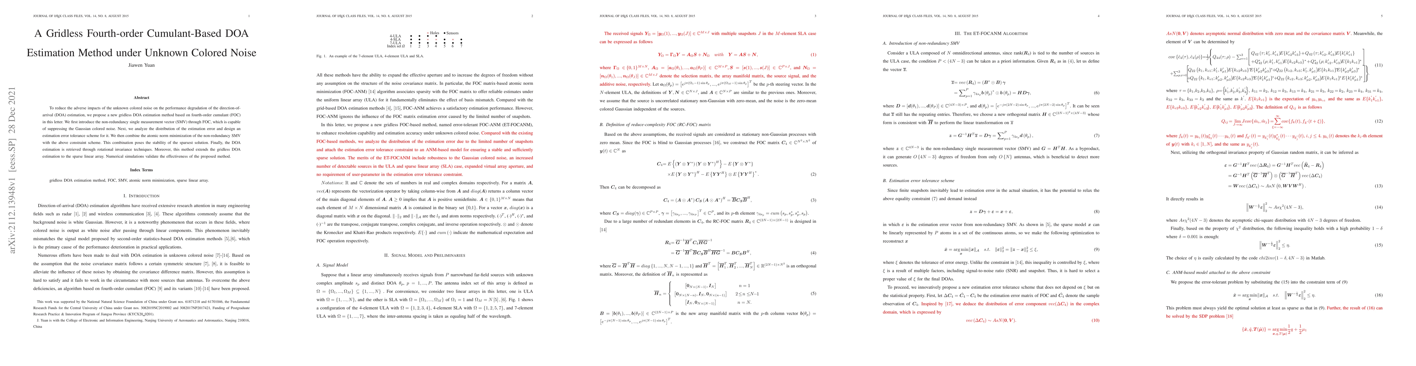 This paper proposes a gridless direction-of-arrival (DOA) estimation method based on fourth-order cumulant (FOC) to mitigate the effects of unknown colored noise. The method utilizes a non-redundancy single measurement vector (SMV) to suppress Gaussian noise and employs an estimation error tolerance scheme for stability, ultimately retrieving DOA through rotational invariance techniques.