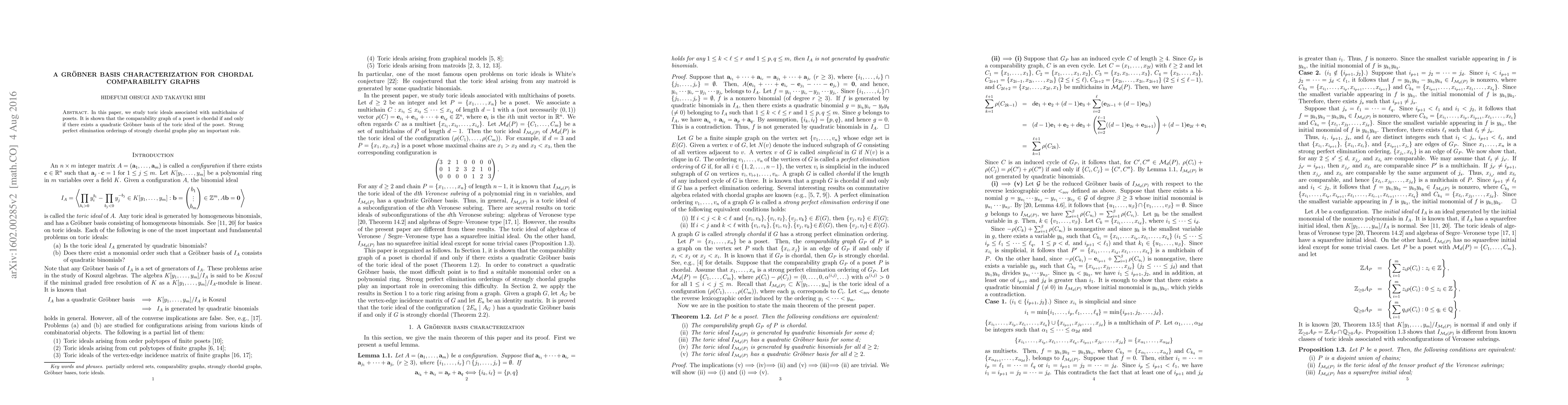 In this paper, we study toric ideals associated with multichains of posets. It is shown that the comparability graph of a poset is chordal if and only if there exists a quadratic Gr\"obner basis of the toric ideal of the poset. Strong perfect elimination orderings of strongly chordal graphs play an important role.