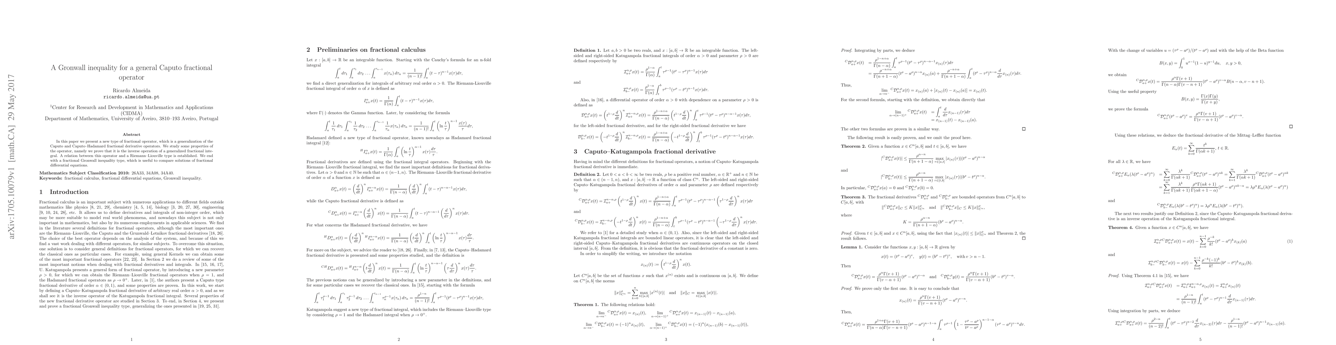 This paper introduces a generalized Caputo fractional operator and proves its inverse relationship with a generalized fractional integral. It also establishes a connection to the Riemann-Liouville type operator and concludes with a new fractional Gronwall inequality useful for comparing solutions of fractional differential equations.