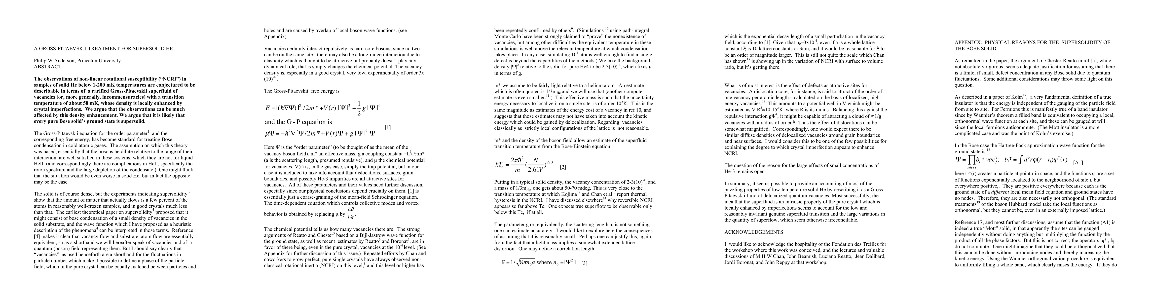 The observations of non-linear rotational susceptibility (NCRI) in samples of solid He below 1-200 mK temperatures are conjectured to be describable in terms of a rarified Gross-Pitaevskii superfluid of vacancies (or, more generally, incommensuracies) with a transition temperature of about 50 mK, whose density is locally enhanced by crystal imperfections. We argue that the observations can be much affected by this density enhancement. We argue also that it is likely that the ground state of every pure Bose solid is supersolid.