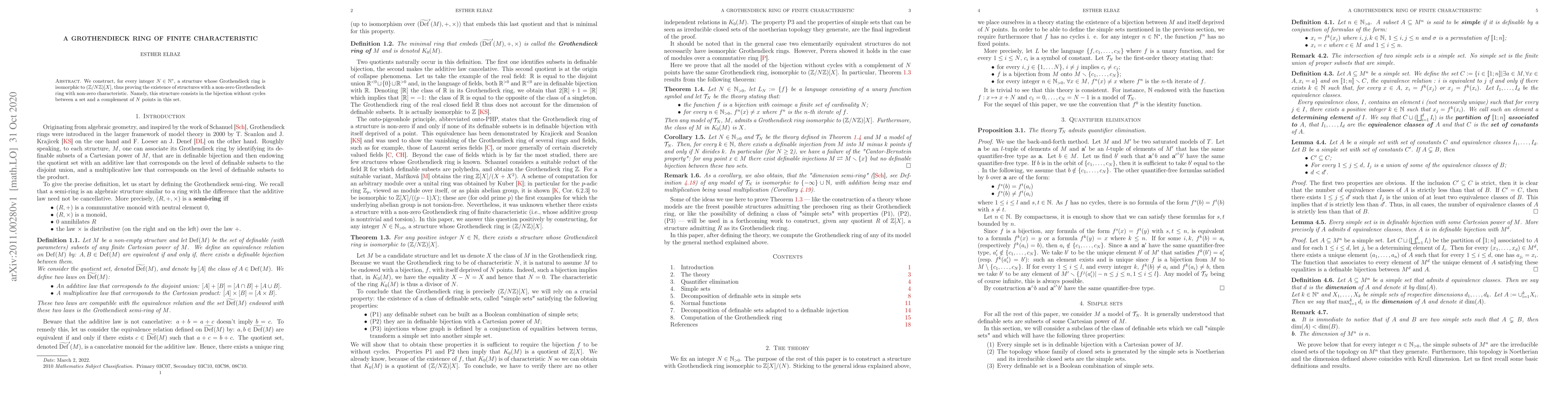 This paper constructs a structure for every integer $N$ whose Grothendieck ring is isomorphic to $(\mathbb{Z}/N\mathbb{Z})[X]$, demonstrating the existence of structures with non-zero characteristic in their Grothendieck ring. The structure involves bijections without cycles between a set and its complement of $N$ points.
